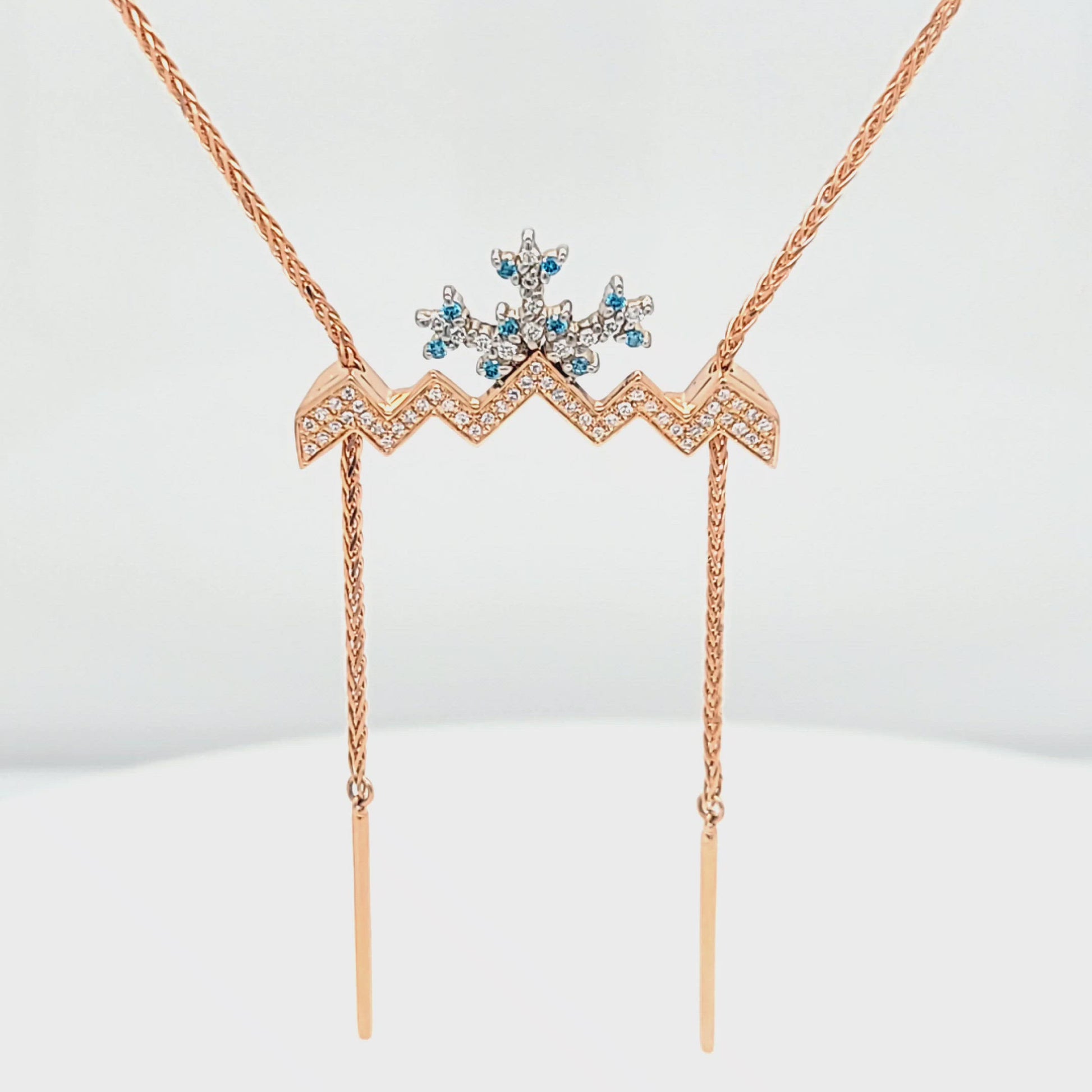 The lariat design, symbolic of the mountain ranges, is brought to life with rose gold, while the descending snowflake, crafted in white gold, glistens like a freshly fallen flake under the winter sun. This necklace is more than just an accessory; it's a statement of your love for nature's grandeur and a testament to Park City Jewelers' three decades of unparalleled craftsmanship.