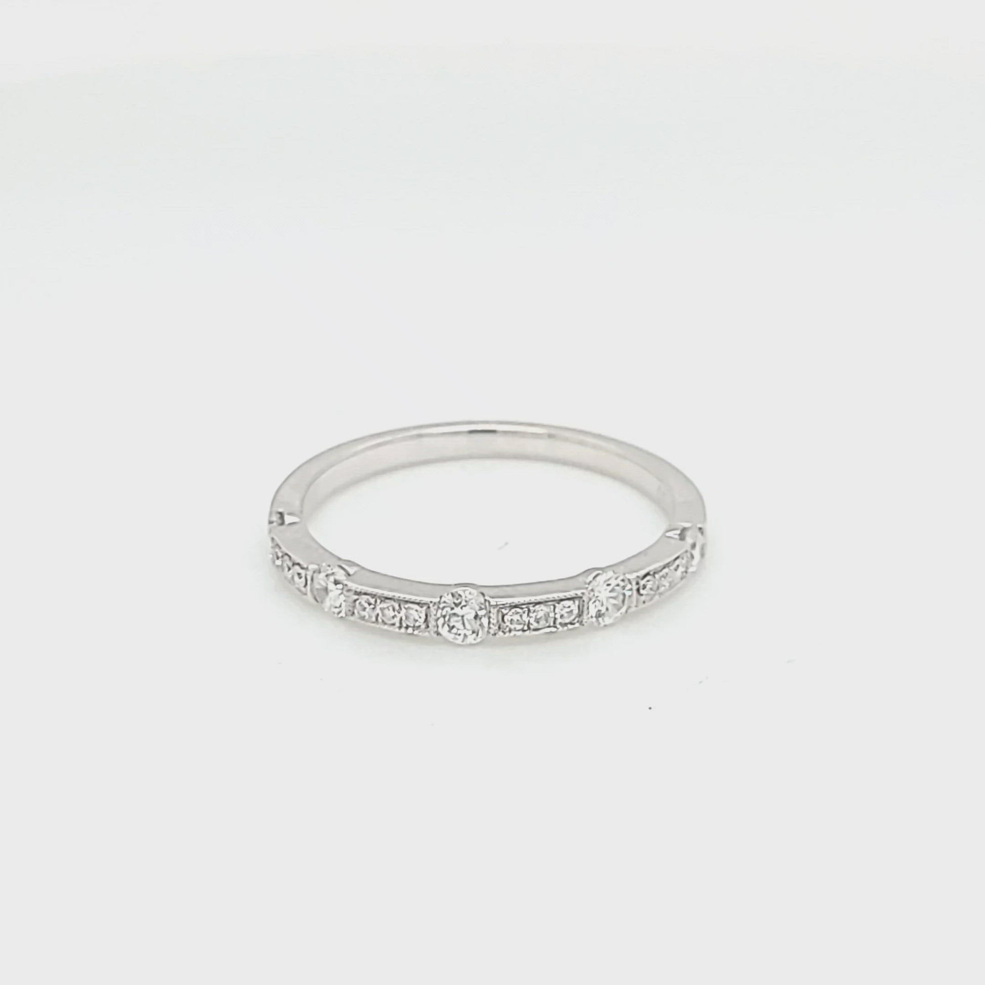 Intricate details such as milgrain edging imbue this band with a sense of historical beauty and craftsmanship, reminiscent of a bygone era. This design not only complements diamond engagement rings with its unique vintage styling but also stands as a statement piece when worn alone. The alternating pattern of diamonds provides a dynamic sparkle, making this band a versatile choice for various occasions, from casual elegance to formal events.