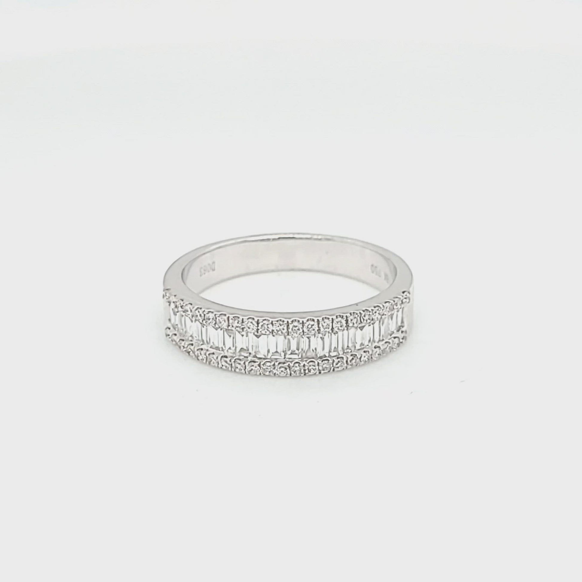 Park City Jewelers presents the Baguette Diamond & Double Row Round Diamond Ring, a sophisticated piece that artfully blends geometric precision with classic radiance. This ring, exquisitely crafted in 18K white gold, features a stunning arrangement of .63ctw diamonds, bringing together the sleek elegance of baguette diamonds with the timeless sparkle of round colorless diamonds. The central row of baguette diamonds is flanked by rows of round diamonds along the top and bottom, creating a beautiful contrast and enhancing the overall brilliance of the ring. This alternating design adds a contemporary twist to the classic diamond ring, making it a perfect choice for those who appreciate a modern take on traditional luxury.