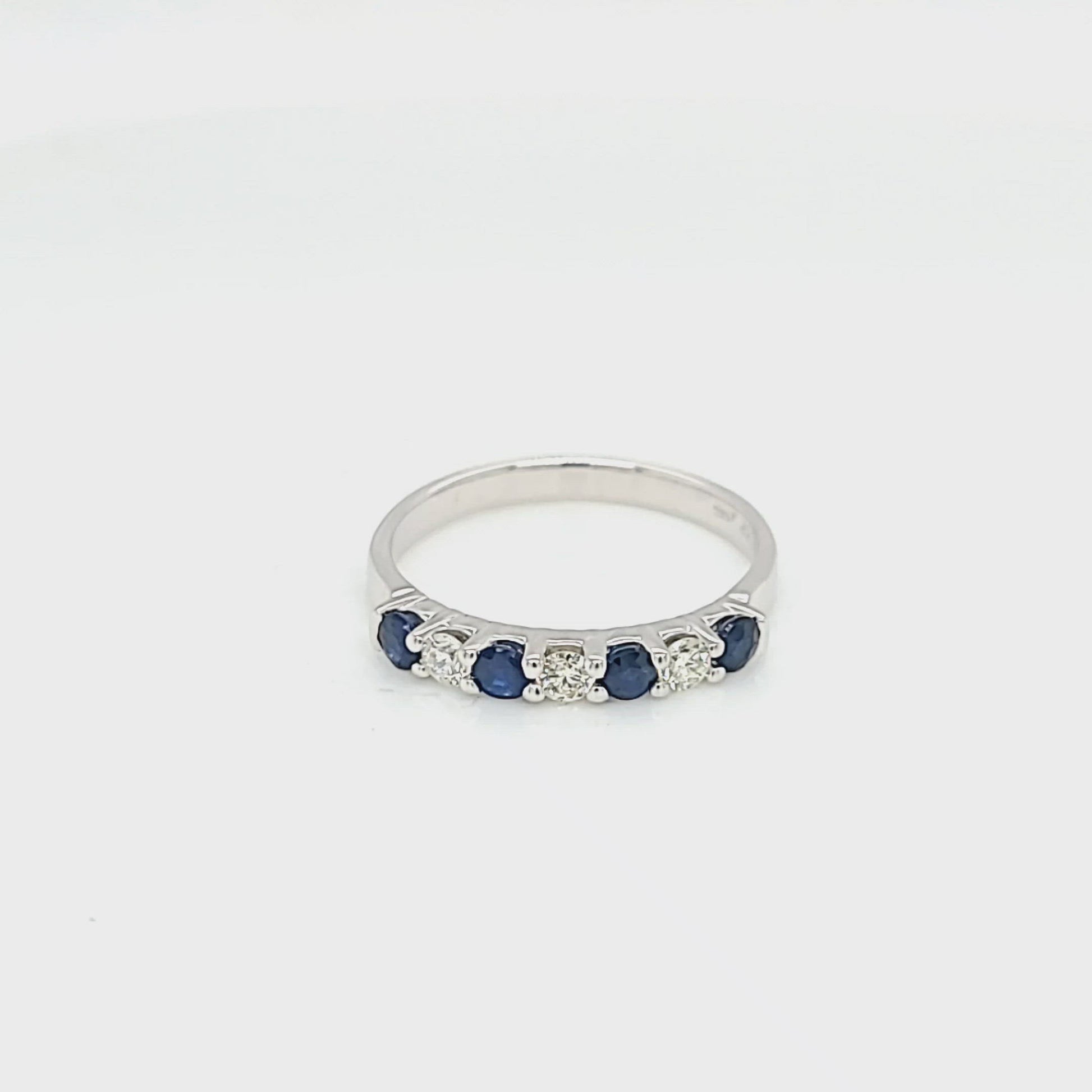 Set in a delicate sequence, four velvety round sapphires exude a deep, enchanting blue, each a window to endless oceans and twilight skies. Interspersed between these sapphires are three dazzling round diamonds, their brilliance reminiscent of stars on a clear night. This alternating arrangement creates a rhythmic play of color and sparkle, making the ring a conversation starter wherever you go.
