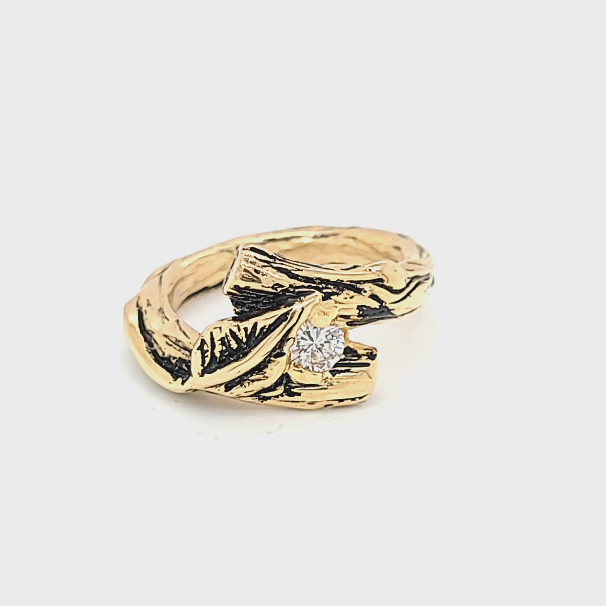 Our master artisans have hand-carved this unique design, infusing each curve of the branches with a sense of organic dynamism and grace. The lustrous 14K yellow gold setting serves as the perfect backdrop to the dazzling brilliance of the round diamond, enhancing its shine and creating a vibrant contrast that is truly breathtaking.