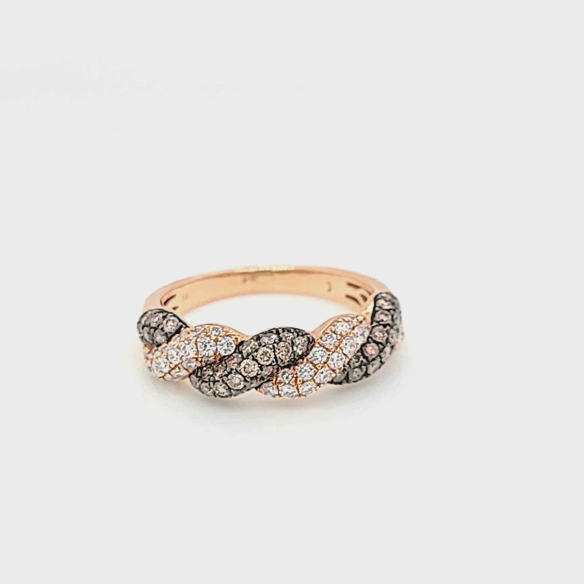 Introducing the Brown and White Diamond Alternating Ring from Park City Jewelers, a captivating piece that intertwines the warmth of nature with the sparkle of luxury. This ring, crafted in 14K rose gold, features a unique twist design, where a strand adorned with .88ctw of shimmering colorless diamonds elegantly intertwines with a strand of rich brown diamonds. This design creates a stunning visual effect, symbolizing the harmonious blending of natural tones and radiant brilliance. The combination of brown and white diamonds set against the soft hue of rose gold makes this ring a sophisticated and contemporary choice for those who appreciate the beauty in contrast and the elegance of intertwined designs.