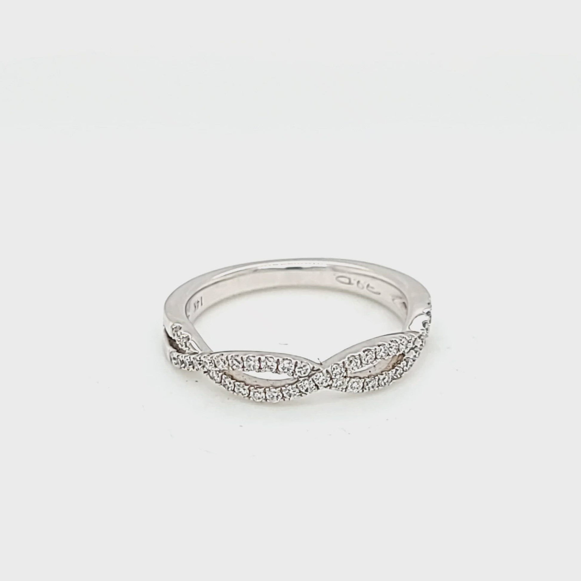 Celebrate everlasting love and devotion with our Bypassing Intertwined Diamond Band, exquisitely crafted in 14K white gold. This stunning infinity ring features a total of .26 carat weight diamonds, demi-pavé set in shimmering ribbons of 14K white gold that elegantly intertwine to create the iconic infinity symbol.
