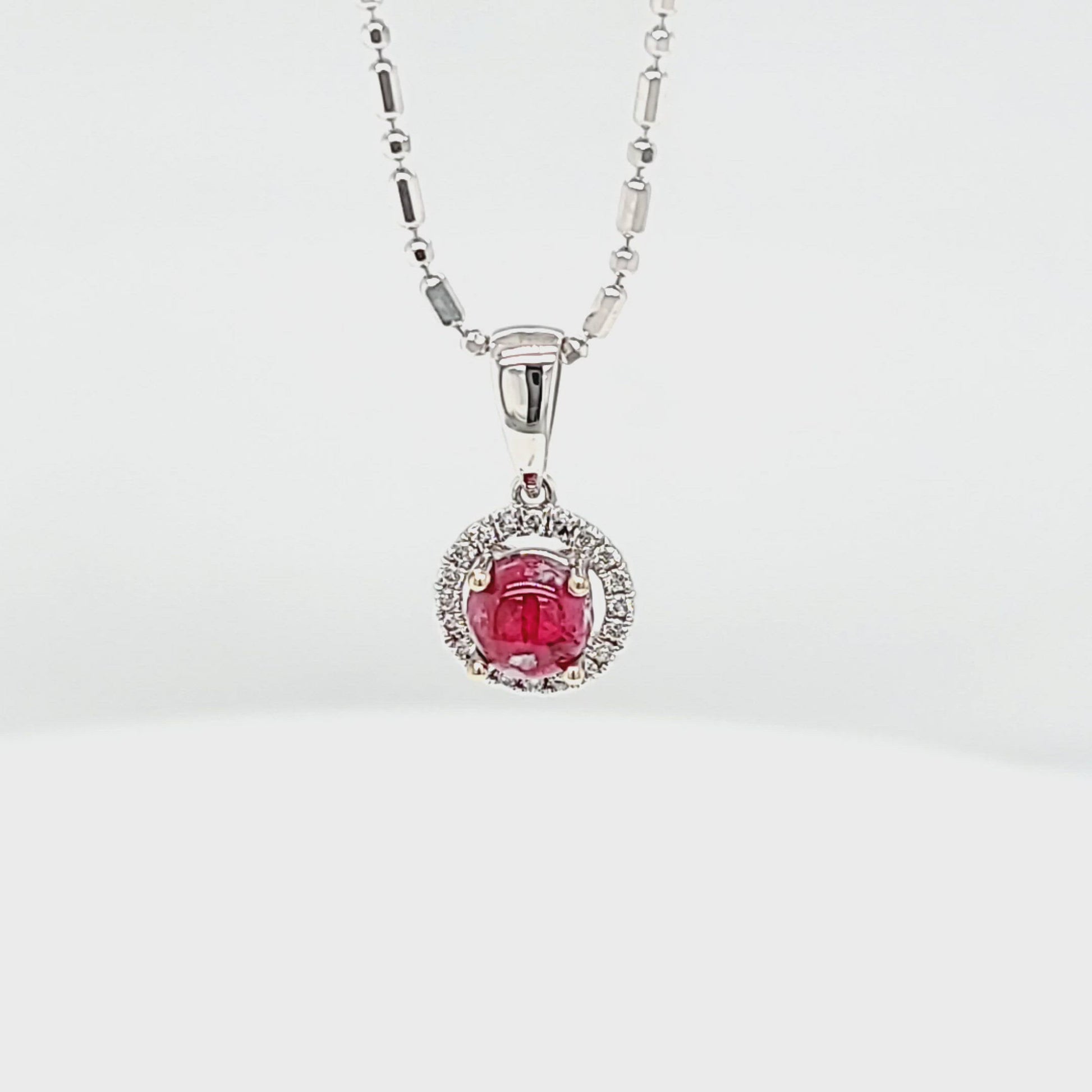 Introducing the Cabochon Cut Red Emerald Halo Style Pendant from Park City Jewelers, an elegant tapestry woven with 18K White Gold, sumptuous Red Emerald, and dazzling Diamonds. This pendant is the epitome of refinement, with a resplendent .42 carat Red Emerald Cabochon at its heart, encircled by a halo of .09 carats of scintillating diamonds.