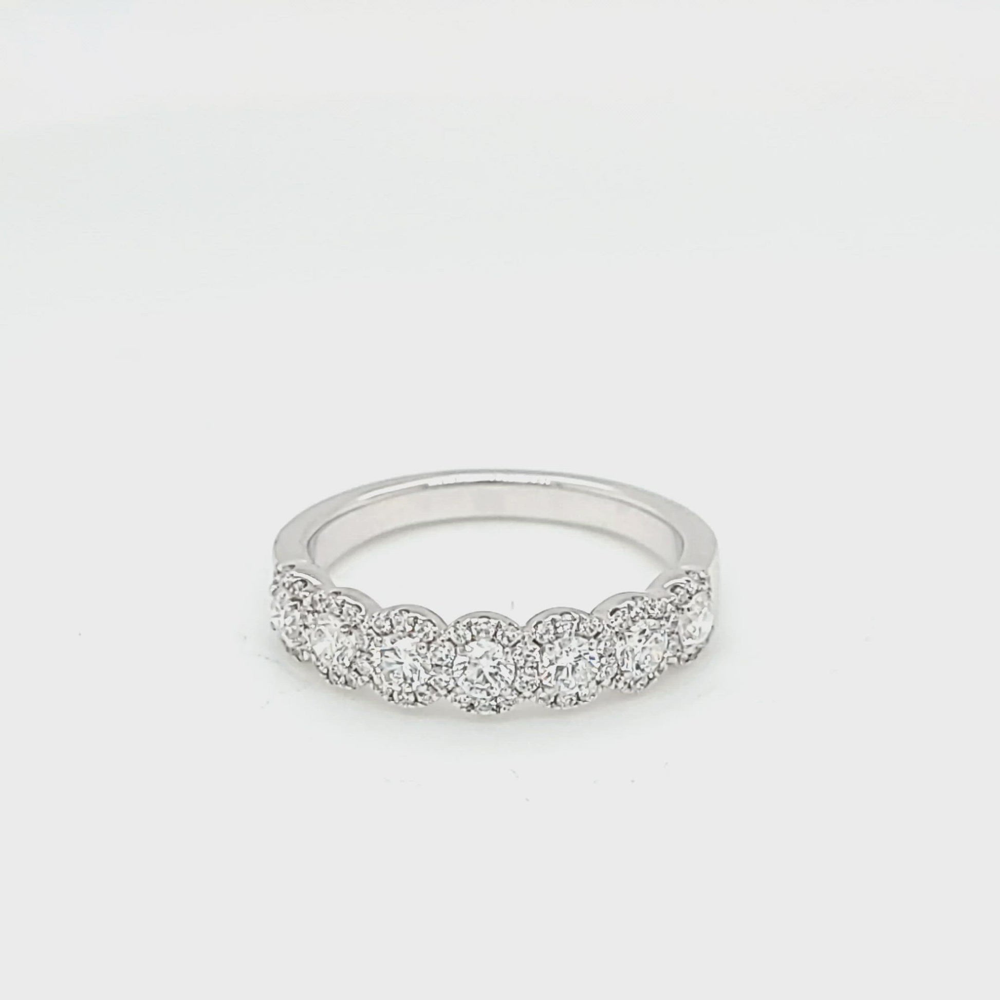 The vintage-inspired design showcases halos of demi-pavé set diamonds surrounding each of the seven larger diamonds, creating a captivating and unique look. The intricate arrangement of diamonds ensures a dazzling display of light and sparkle from every angle, making this ring a true statement piece.
