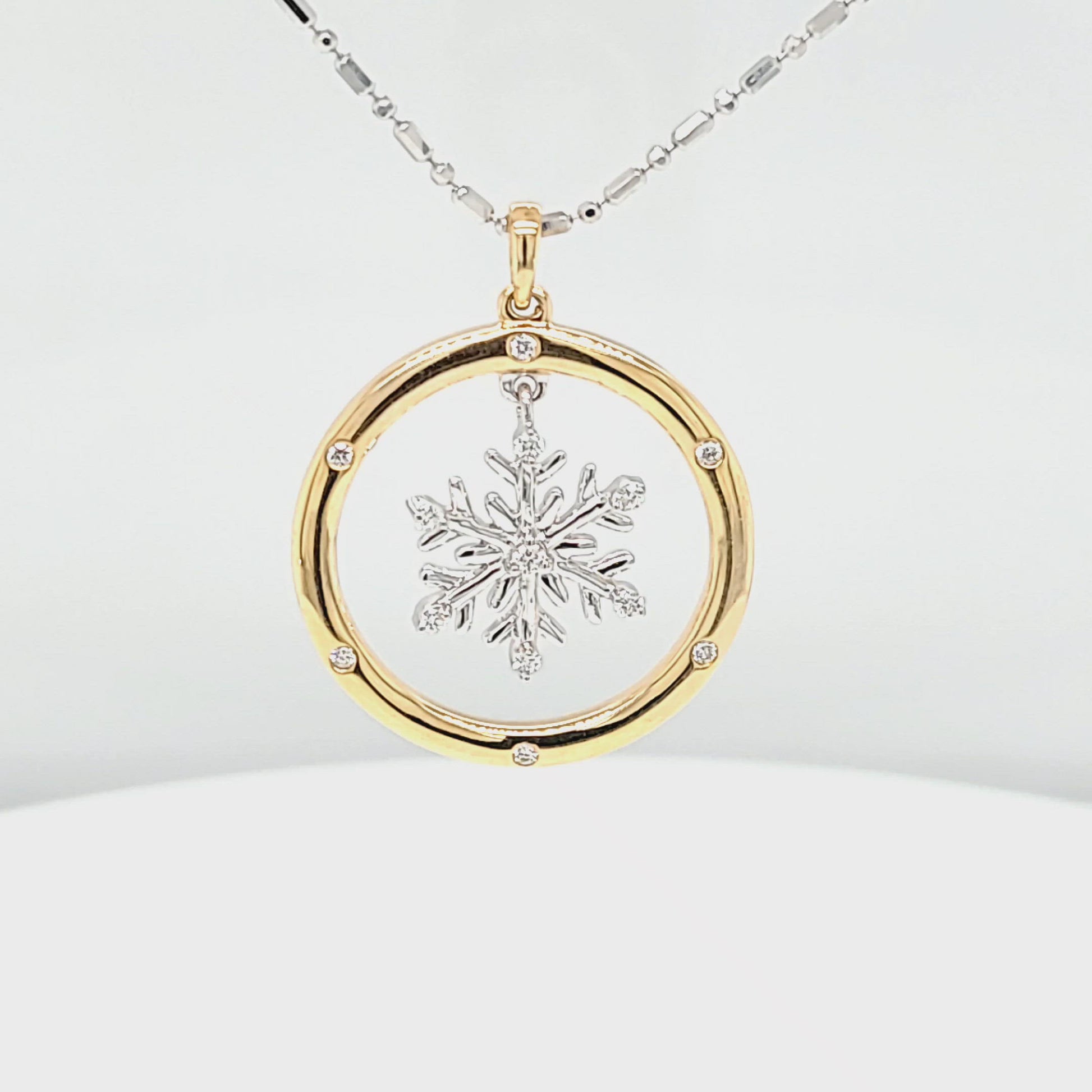 Crafted in luminous 14K white gold, the centerpiece is an exquisitely detailed snowflake, each tip cradling a diamond, with a central diamond that twinkles like a winter star. This delicate wonder is encased in a circle of warm 14K rose gold, its rim dotted with diamonds that shine with a soft, yet insistent glow. The harmonious blend of white and rose gold evokes images of fresh snow against the warm hues of a winter sunset.