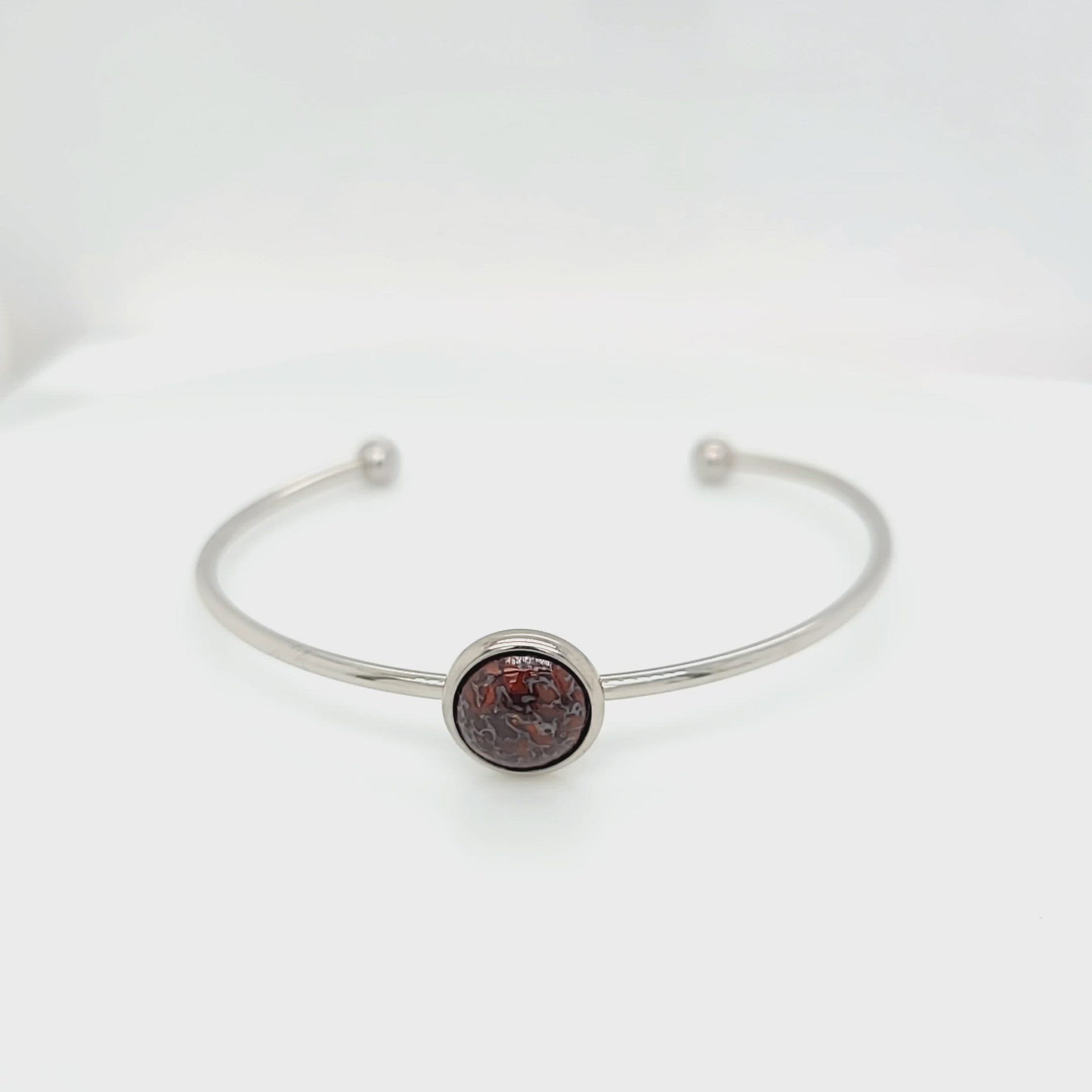 Echoing the fierce beauty of the Jurassic era, the bone fragment offers a glimpse into the ancient past, its unique cell structure and colors testament to its age and rarity. The fossil's raw appeal is perfectly complemented by the modern elegance of stainless steel, resulting in a bracelet that pairs as effortlessly with casual outfits as it does with evening attire.