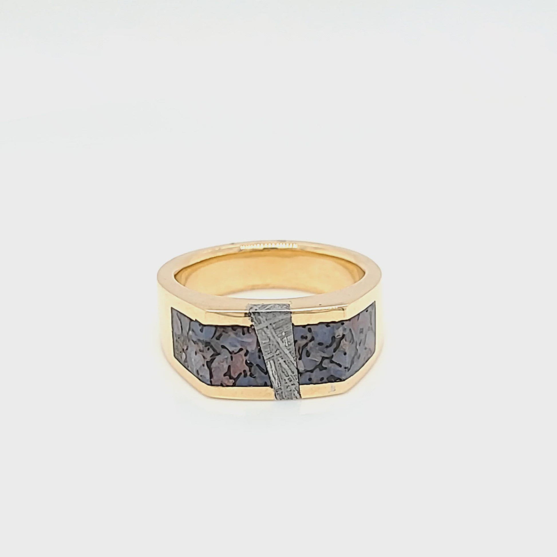 Introducing our remarkable Dinosaur Bone Inlay Ring with Meteorite Strike - an extraordinary testament to our timeless planet's history and a symbol of our timeless craftsmanship. Fashioned with passion by Park City Jewelers, a leader in distinctive jewelry for over 30 years, this men's ring is a vivid celebration of rarity and resilience.