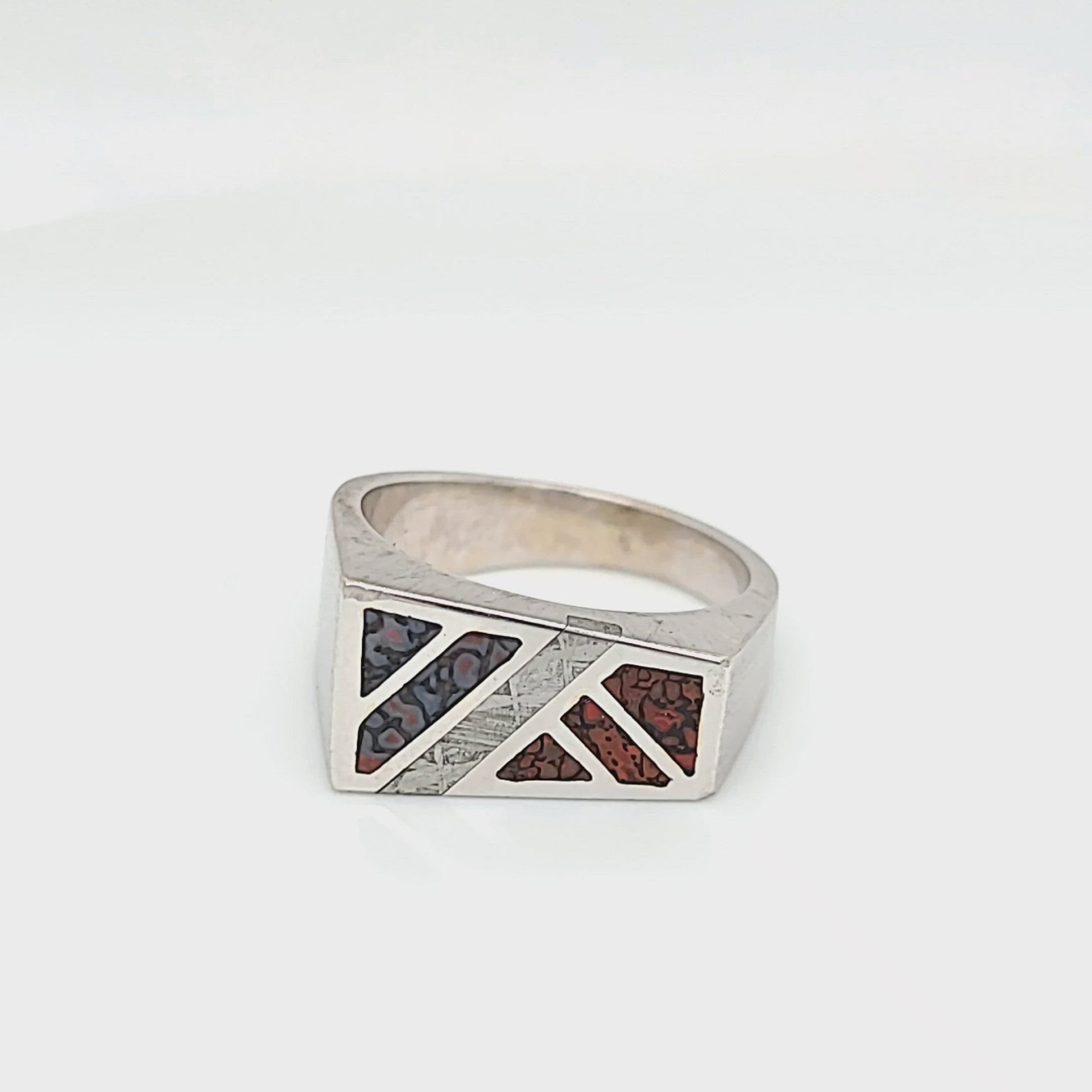 Elevating the allure of this extraordinary creation is a meteorite inlay, cutting across the ring in a vivid display of cosmic rarity. This striking feature offers a captivating juxtaposition, fusing an artifact from the depths of earth's history with a fragment from the far reaches of the cosmos.