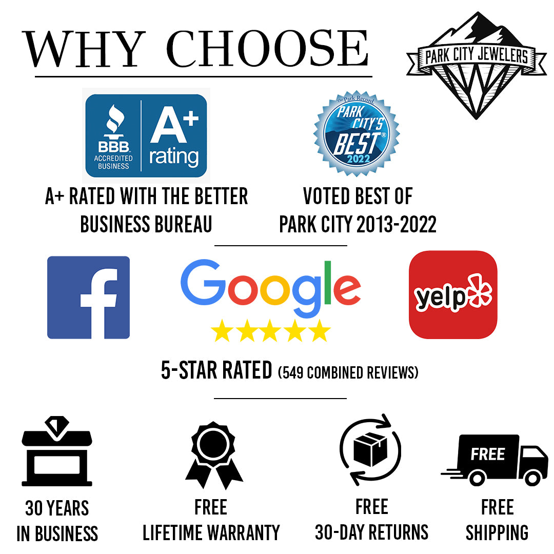 At Park City Jewelers, we've proudly served our customers for over 30 years as a family-owned and operated business. Our commitment to exceptional craftsmanship and unparalleled customer care has earned us a 4.9-star rating from 563 Google reviews, an A+ rating with the Better Business Bureau, and the honor of being voted 'Best in Park City' for 12 consecutive years. When you shop with us, you're choosing quality, trust, and lasting beauty.