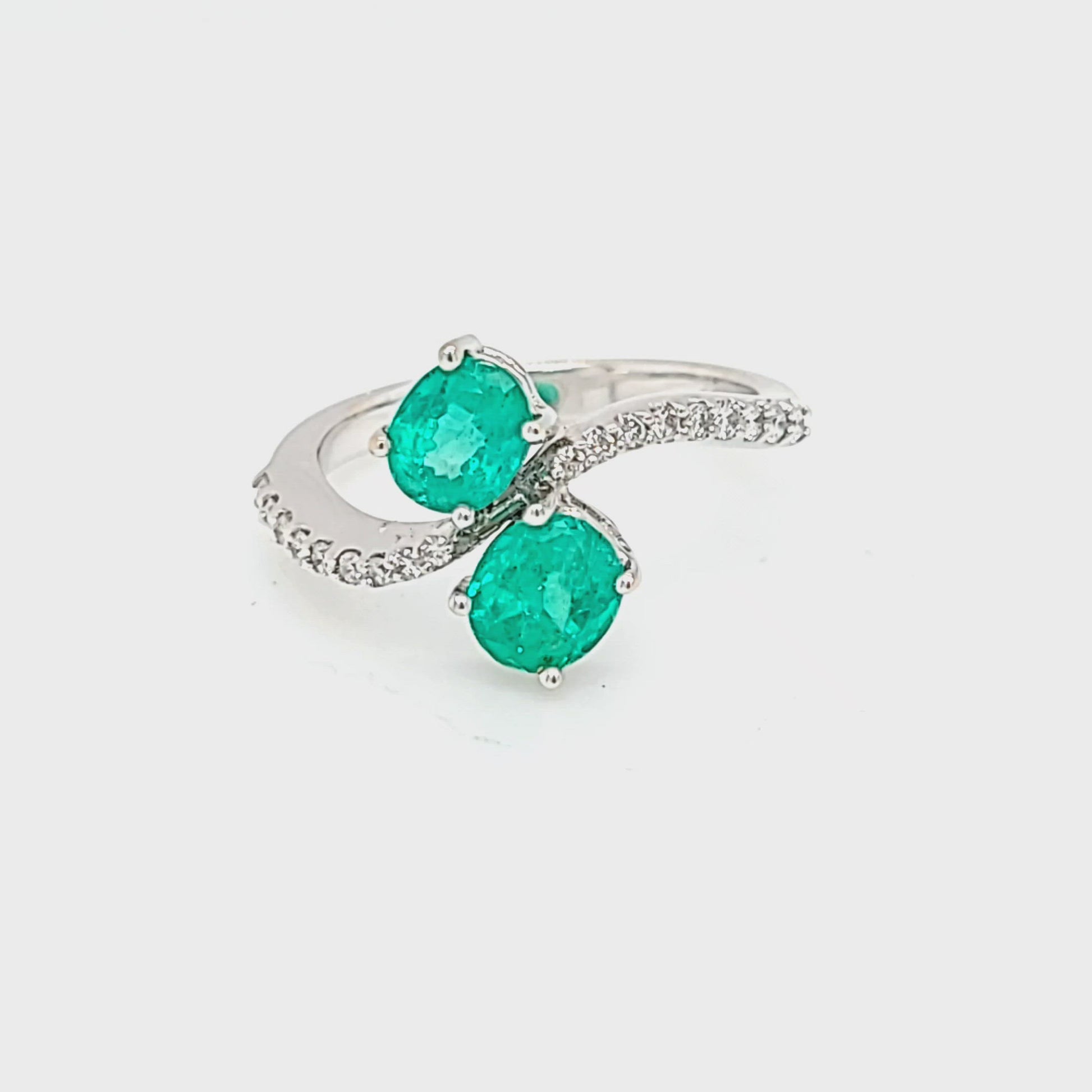 Held delicately within the embrace of 18K white gold are two mesmerizing oval emeralds. Their rich green glow symbolizes the very essence of nature's allure. In an elegant dance around these gems, 18 twinkling round diamonds cascade down, across, and down the shank. This dynamic bypass design creates an illusion of movement, as though the diamonds are gracefully flowing around the stunning emeralds.