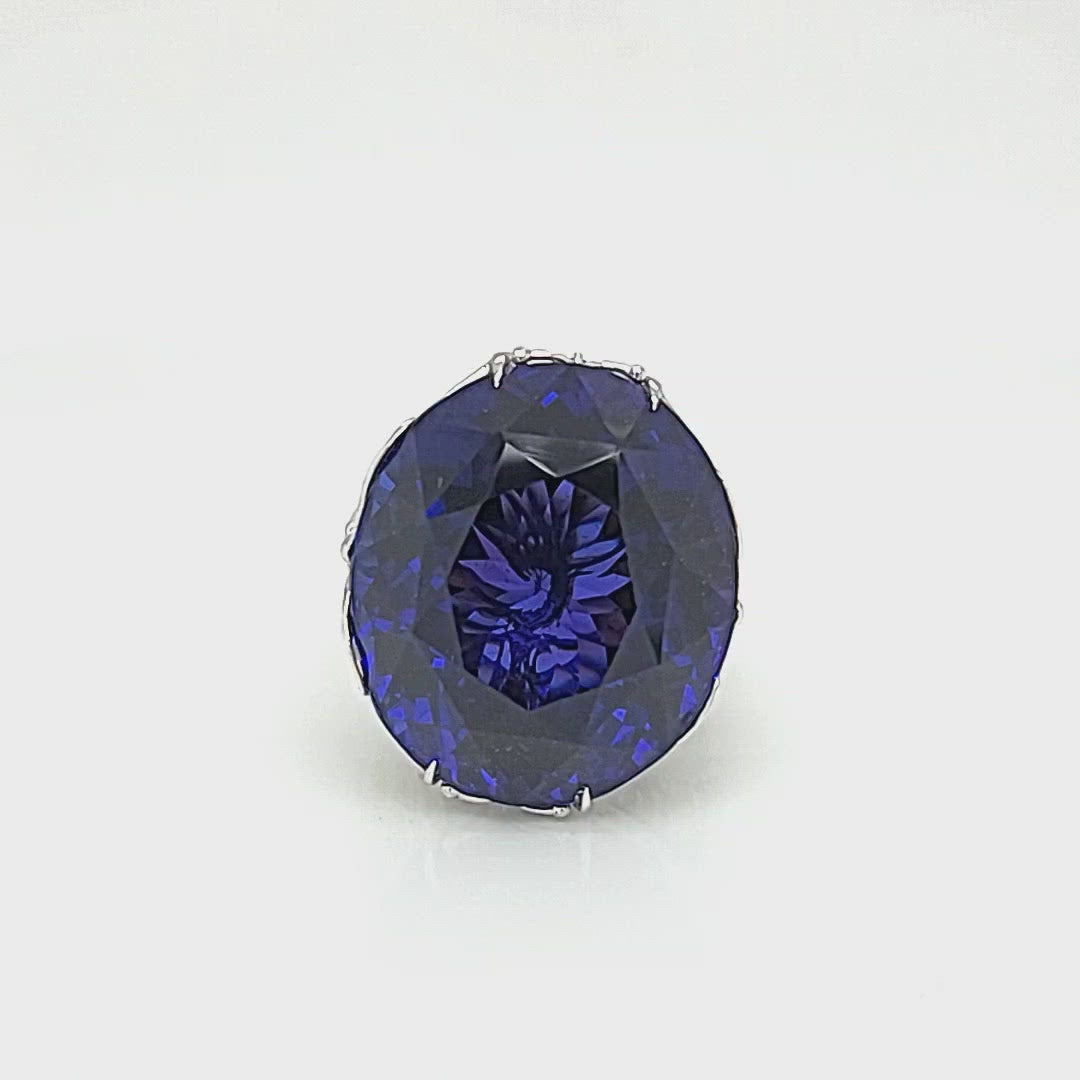 Embrace the metamorphosis of nature and design with Park City Jewelers' transcendent Fancy Cut Oval Tanzanite & Diamond Accented Butterfly Look Ring. Nestled in luxurious 18K white gold, this ring features an expansive 52.25ctw Tanzanite, an emblem of the mysteries of Tanzania's landscapes. The rare red flashes this gem exudes are reminiscent of the fleeting moments a butterfly takes to spread its wings, capturing hearts and glances alike.