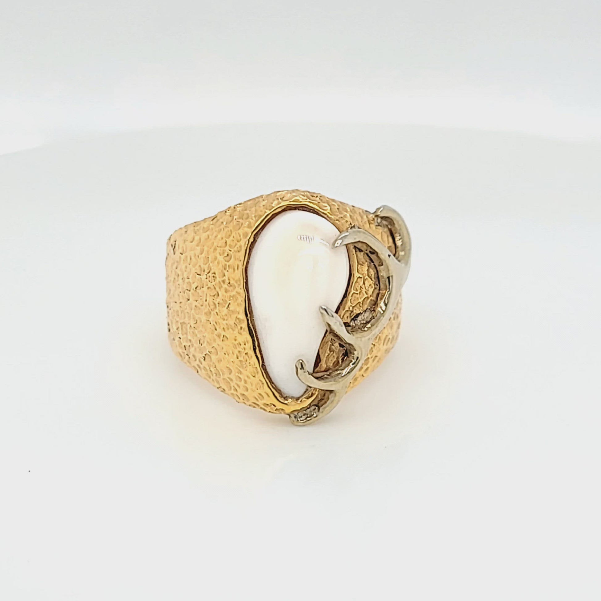 The ring features an exclusive hammered finish, a rugged and striking stage for your cherished elk's tooth. Each mark on the 14K yellow gold band reverberates the spirit of the wild, reflecting the relentless quest for the elusive, majestic trophy elk.