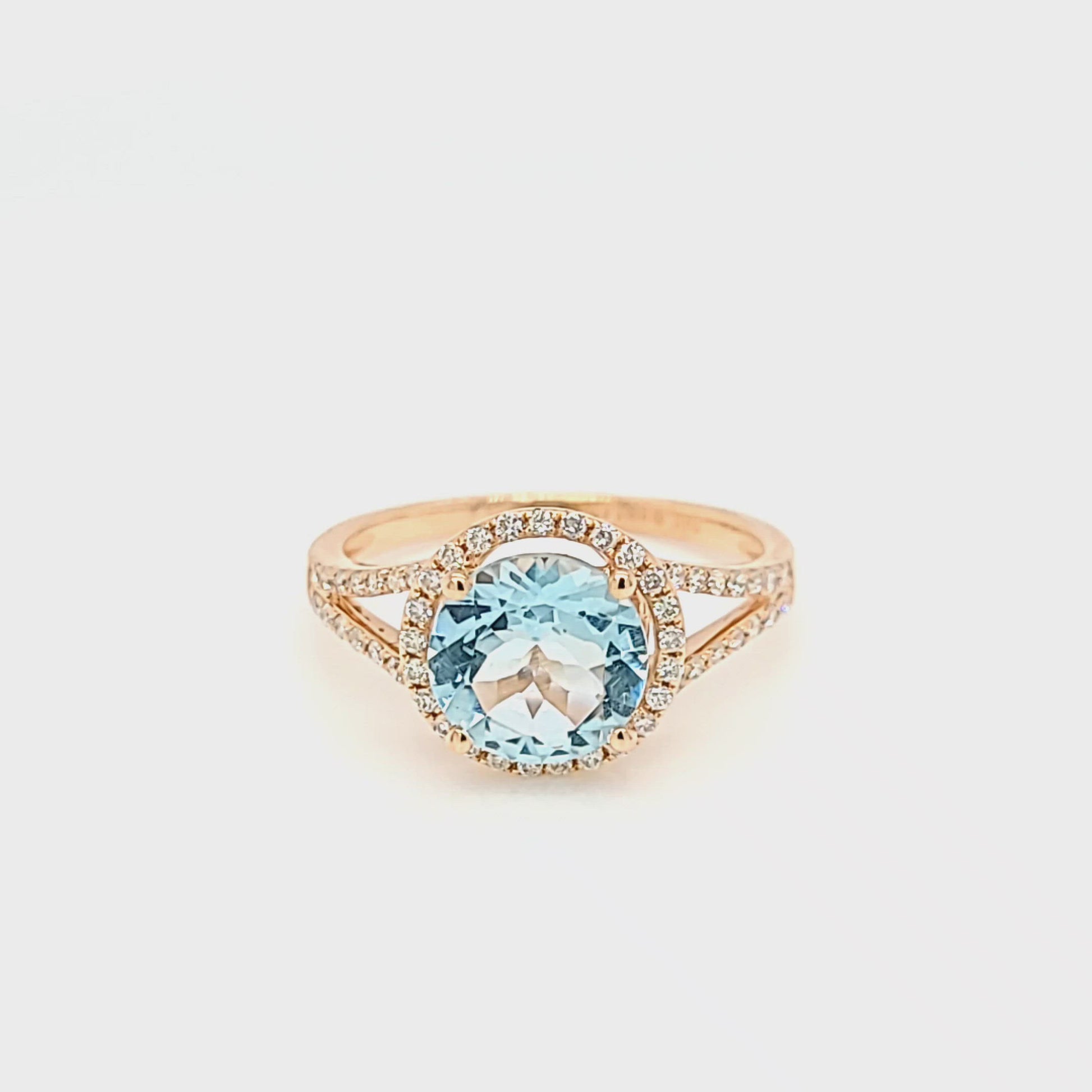 Round Aquamarine and Diamond Rose Gold Split Shank Ring