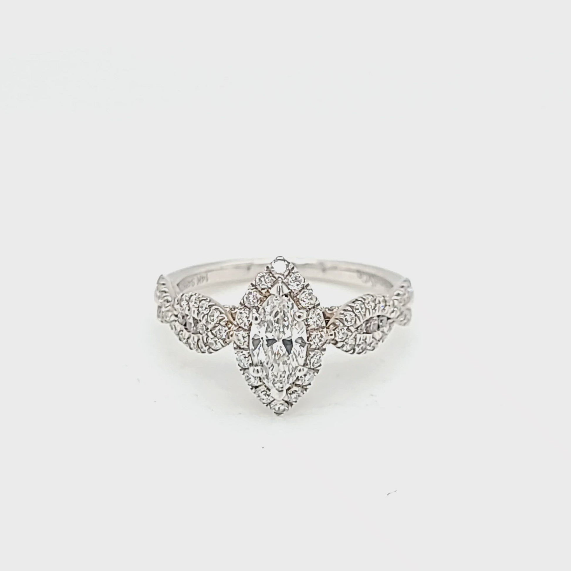 This .47 carat marquise diamond is securely held with four prongs of 14K white gold along with V-prongs protecting each point of the marquise diamond. A halo of shimmering round diamonds elegantly surrounds the center diamond. Intertwining ribbons of 14K white gold are demi-pave set with round diamonds to form the shank of the ring. Vintage-inspired styling with diamond brilliance combine to create this amazingly brilliant and elegant marquise diamond engagement ring.