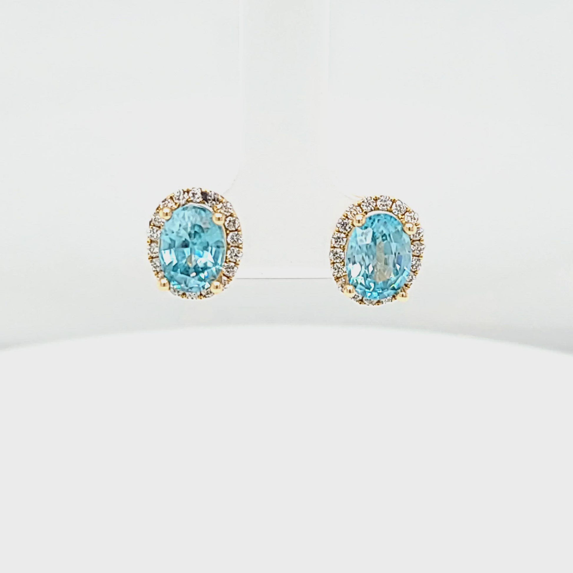 14K Yellow Gold Oval Blue Zircon & .36ctw Diamond Halo Stud Earrings