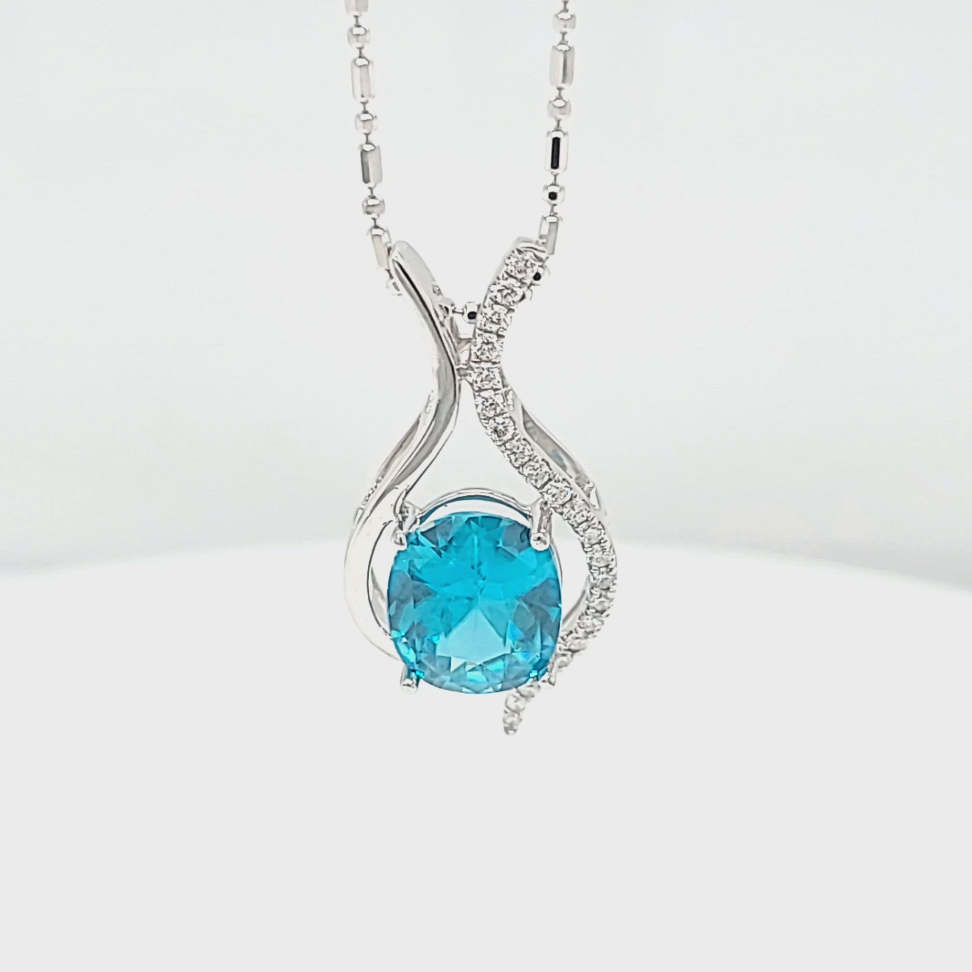 The charm of this pendant is further accentuated by a graceful swirl on one side, encrusted with a trail of twinkling .24ctw diamonds. This diamond-adorned curve artfully contrasts with the smooth, polished white gold surface on the other, creating a modern yet timeless appeal. The whimsical play of light across the diamonds, the white gold, and the serene blue zircon orchestrates a visual melody that's bound to captivate onlookers.