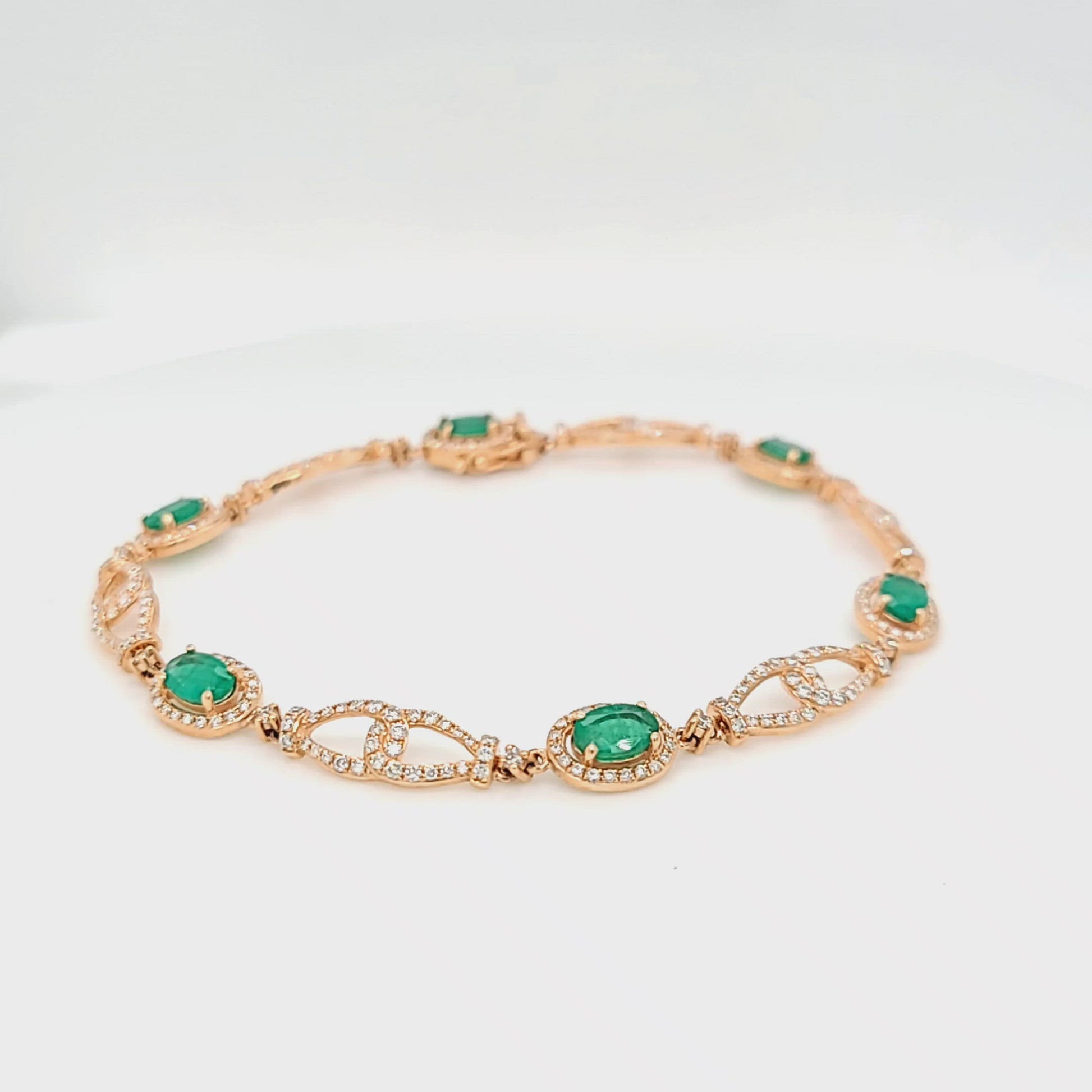 This bracelet beautifully interweaves six captivating oval-cut emeralds, evenly dispersed, casting a harmonious rhythm of verdant luminescence. Each emerald, with its lush green hue, is framed by a halo of brilliant round diamonds, magnifying its inherent beauty. In between these gem-laden focal points, the bracelet's links shimmer, meticulously lined with diamonds, creating a dance of light with every movement.
