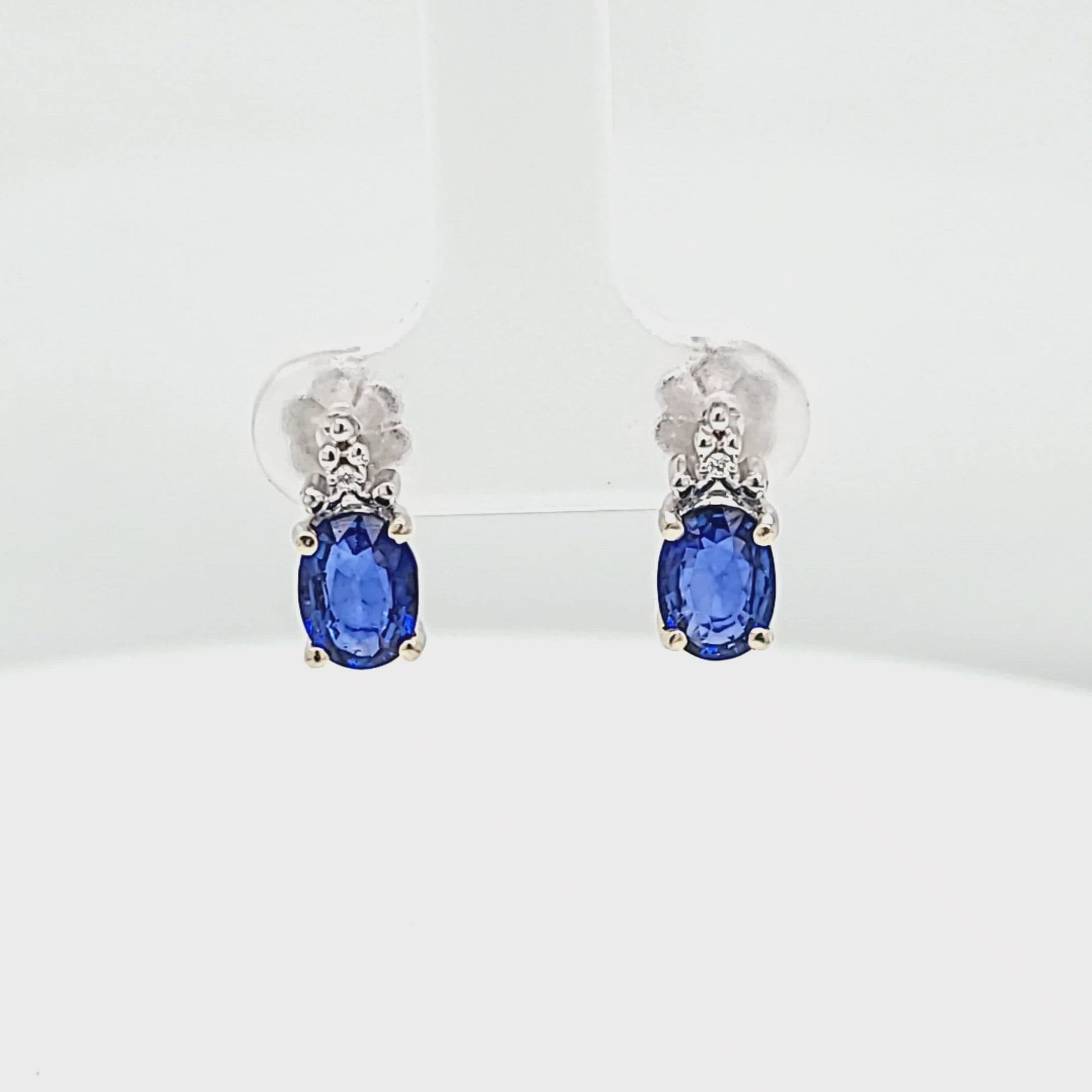 Elevate your elegance with these stunning Oval Sapphire with Diamond Accent Stud Earrings, meticulously crafted in 14K white gold. Each earring showcases a captivating 2.06 carat total weight oval sapphire, known for its deep, enchanting blue hue. A delicate round diamond, set above each sapphire, adds a subtle sparkle, enhancing the overall allure of these timeless pieces.