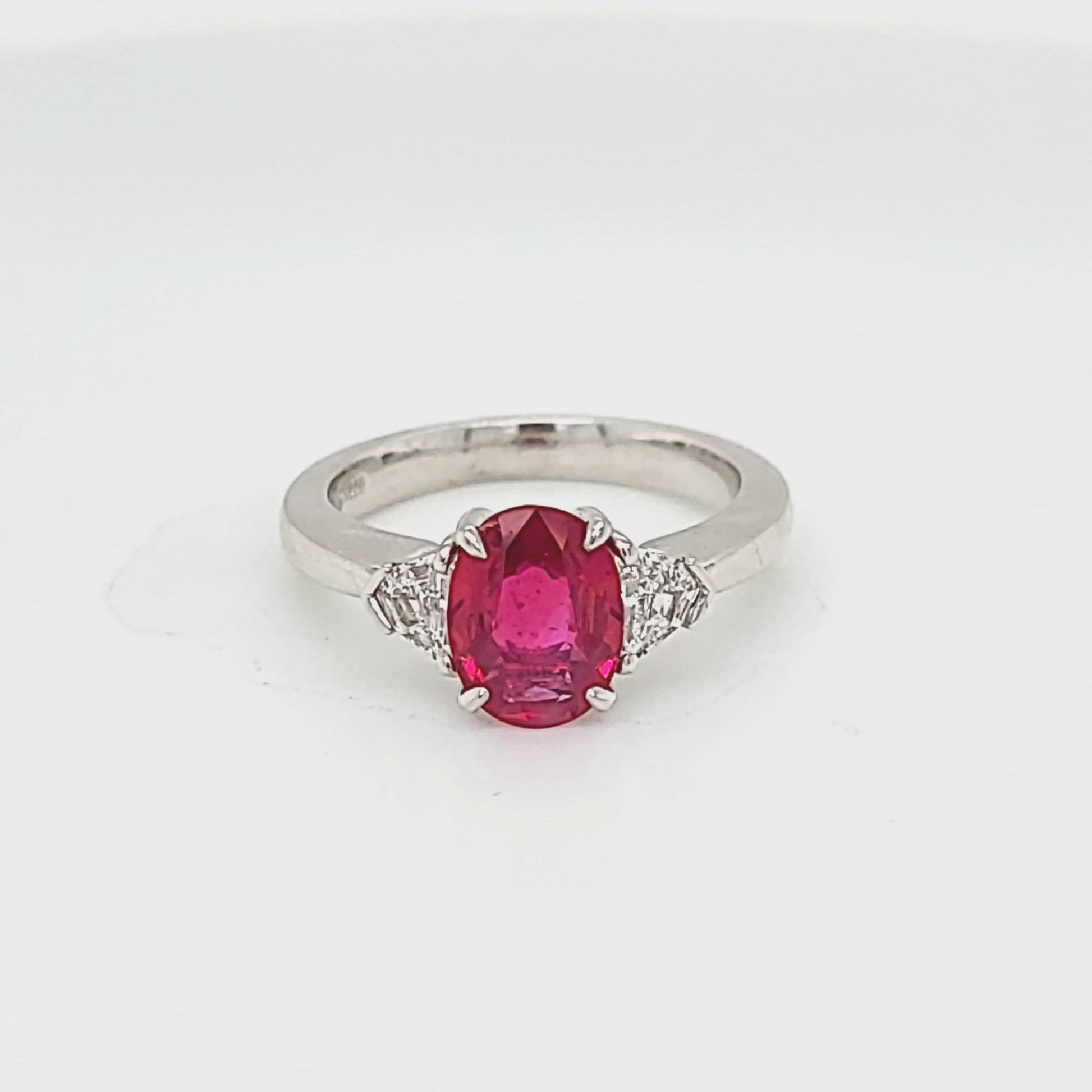 Experience the epitome of luxury and elegance with our Oval Shaped Ruby and Shield Diamond Ring. Expertly crafted from lustrous 18K white gold, this majestic ring features a 1.74ctw ruby centerpiece flanked by two stunning .35ctw shield diamonds. This exquisite piece epitomizes Park City Jewelers' commitment to exceptional craftsmanship and unique design.