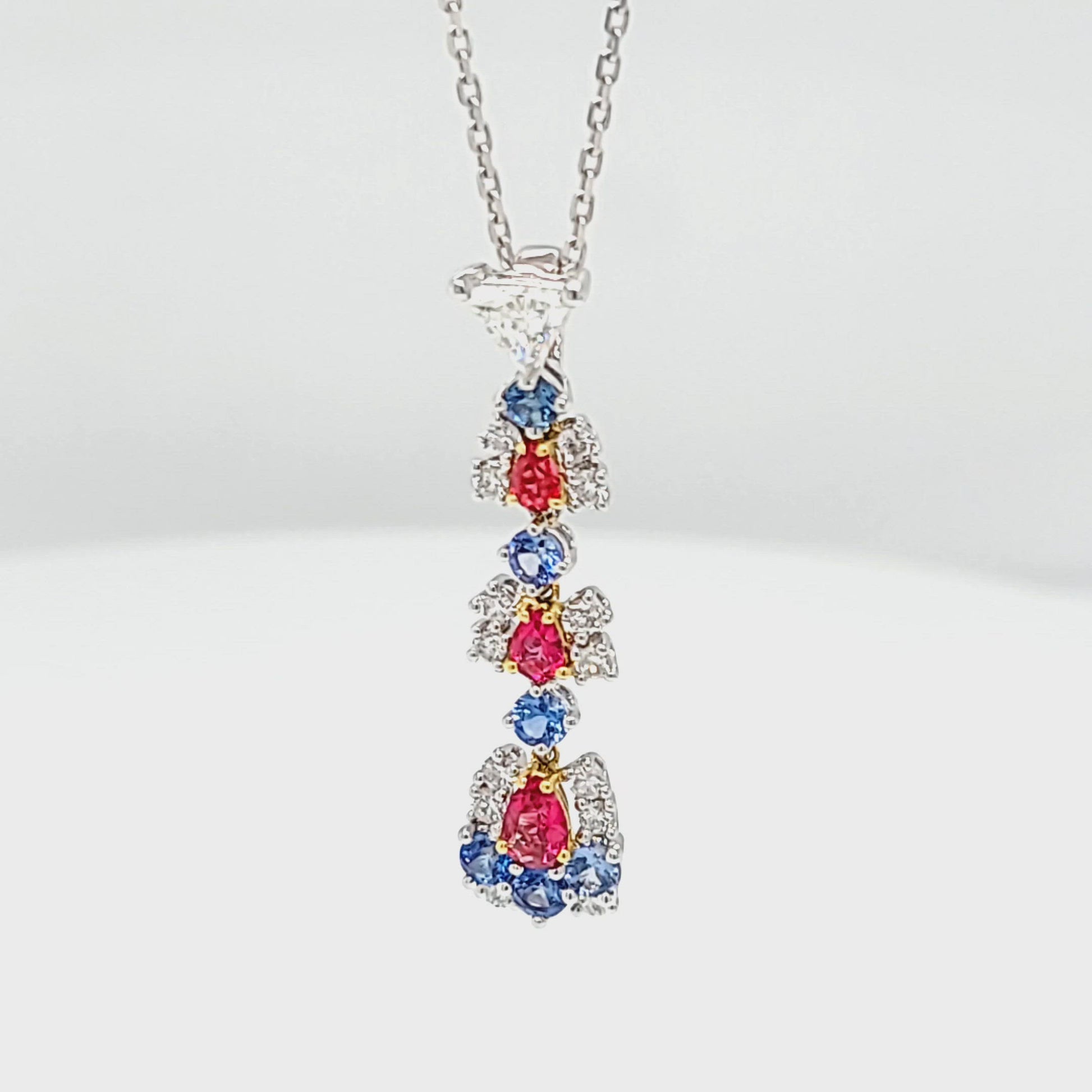 Embrace a treasure from the depths of the earth with our Platinum Red Emerald, Benitoite & Diamond Pendant. This enchanting creation is a cornucopia of rare gems, uniting the fiery ardor of red emerald with the enigmatic allure of benitoite, crowned by the eternal brilliance of diamonds.