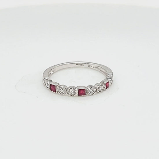 14K White Gold .27ctw Princess Cut Ruby & Round .22ctw Diamond Milgrain Style Stackable Band