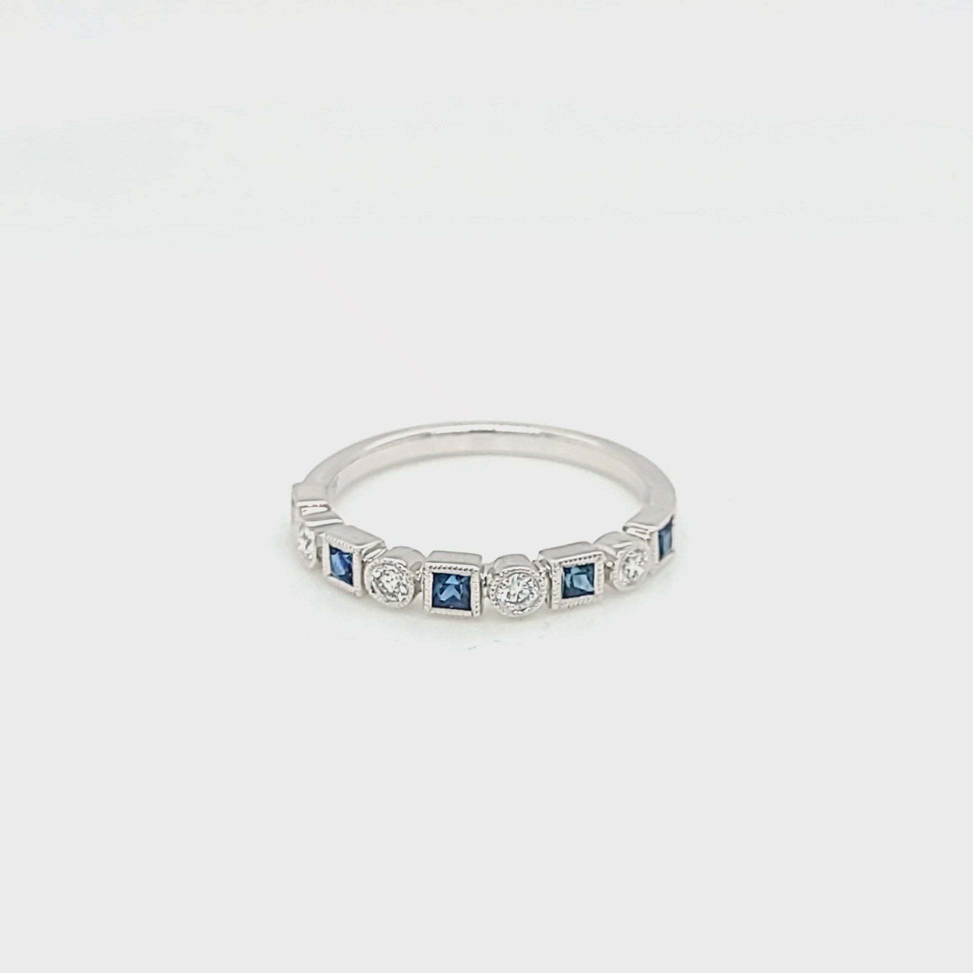 Unveil the magic of timeless beauty with this meticulously handcrafted Sapphire and Diamond stacking band. Reflecting Park City Jewelers' renowned expertise, this ring is an epitome of elegance and sophistication. Crafted in gleaming 14K white gold, it features alternating patterns of radiant .38ctw princess-cut blue sapphires and glistening .12ctw bezel-set diamonds.
