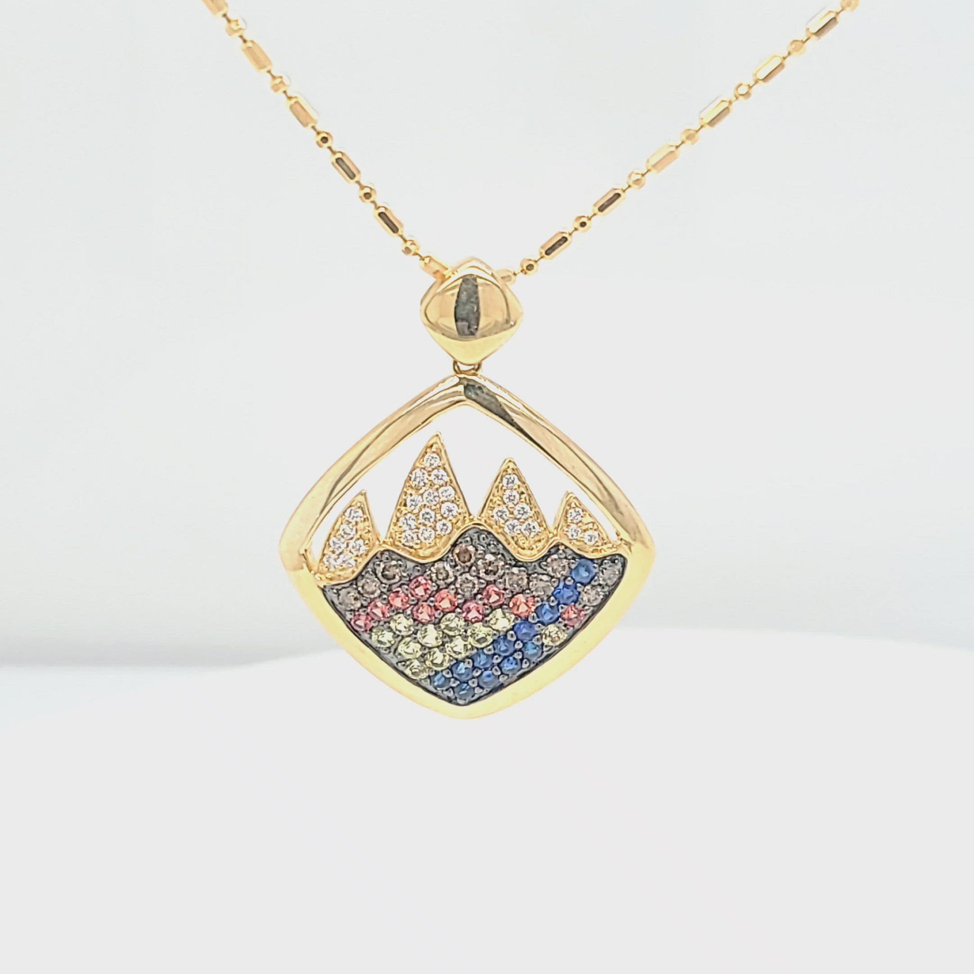 This unique pendant features a captivating mountain scene that sparkles with a .34 carat total weight of pave-set diamonds, illuminating the peaks with a bright shimmer. Further enhancing its beauty, a stunning .70 carat total weight of natural multi-colored sapphires lend a mesmerizing palette to the piece, painting a picture reminiscent of a scenic mountain sunset.