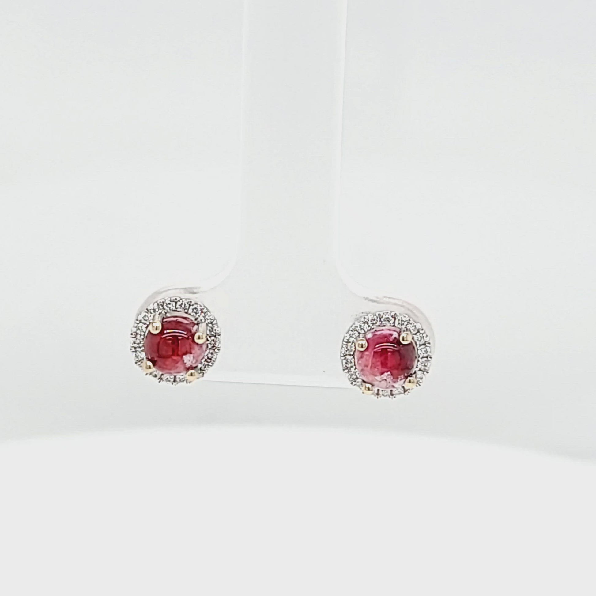 Step into an era of timeless elegance with the Red Emerald Cabochon with Diamond Halo Post Earrings. These enthralling earrings feature the mesmerizing depth of Red Emerald Cabochons, enveloped in an ethereal halo of .11 carat diamonds, set in resplendent 18K White Gold.