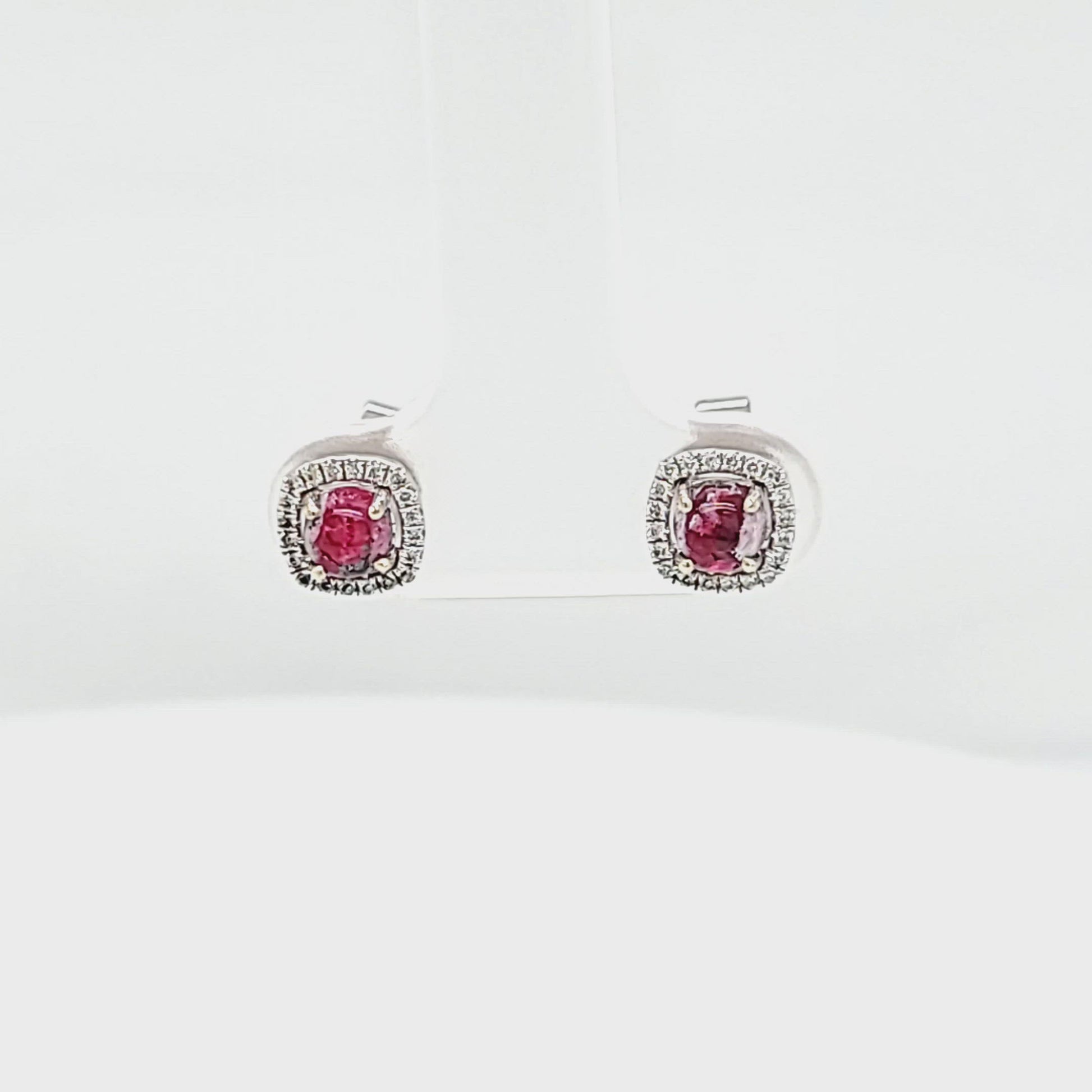 The Red Emerald Cabochon with Diamond Halo Post Earrings is a pair that draws inspiration from the mesmerizing colors of a glowing ember. Crafted in 14K White Gold, each earring is centered with a .49 carat Red Emerald Cabochon, surrounded by a halo of .10 carats of diamonds that emulate sparks of fire.