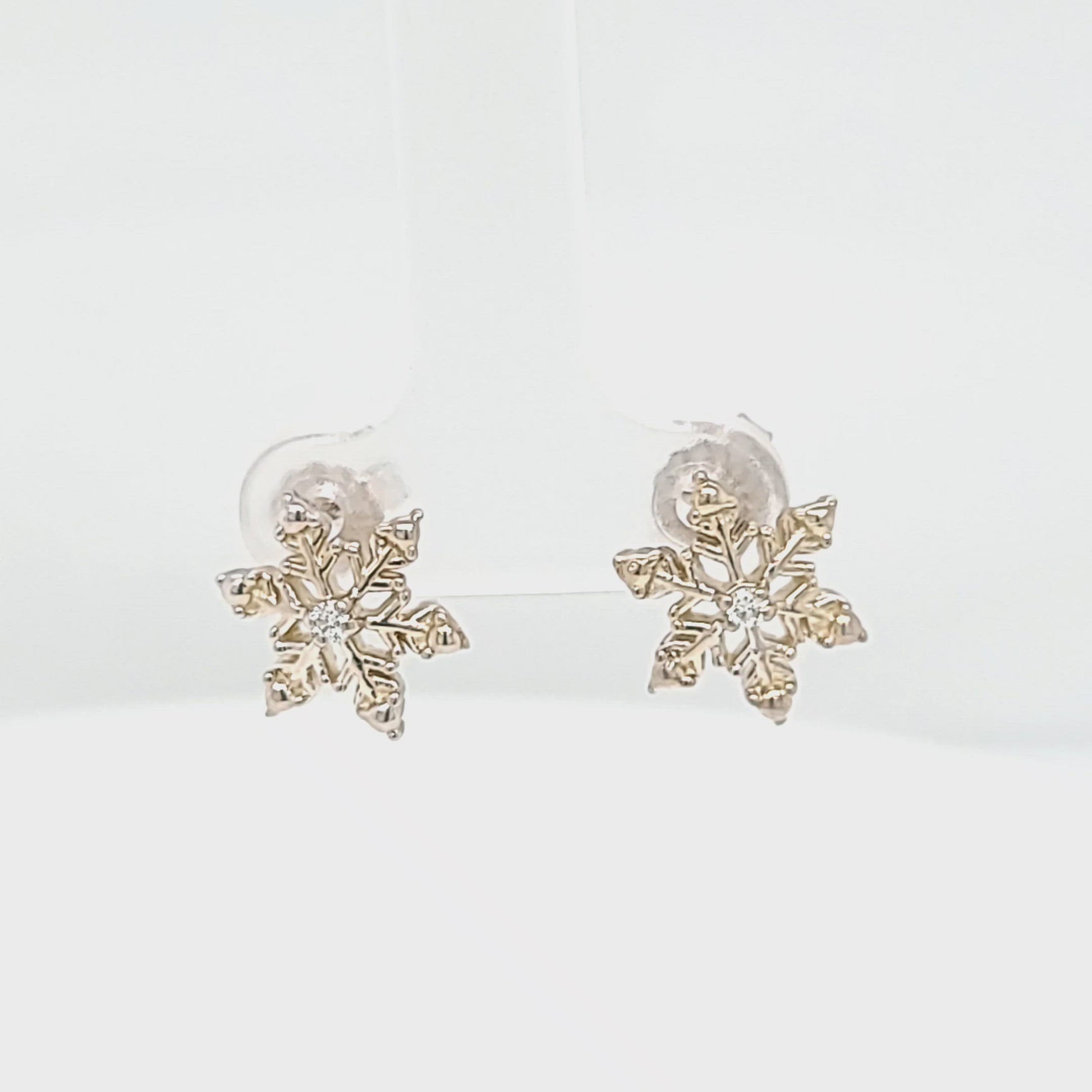 Discover the enchantment of winter with our Gold Single Diamond Snowflake Stud Earrings. Delicately handcrafted from luminous 14K gold, each earring cradles a sparkling .05ctw diamond at its heart, reflecting the ethereal shimmer of a freshly fallen snowflake.