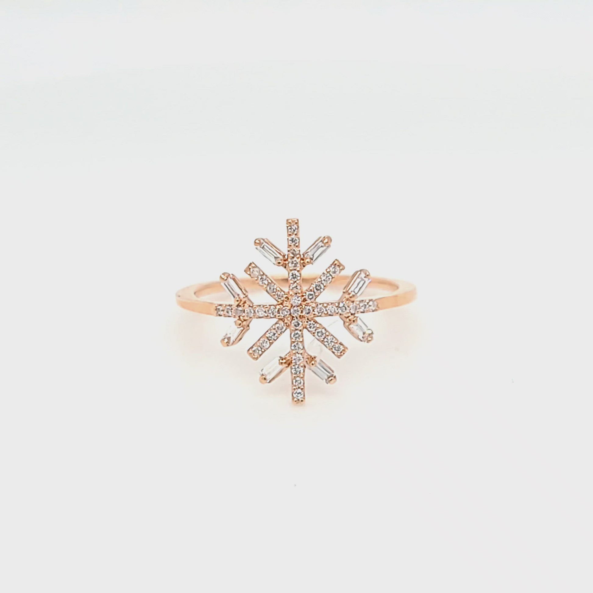 Nestled in 14K white gold, shimmering round diamonds form the heart of this snowflake, echoing the luminosity of winter's first snow under a moonlit sky. Extending from its core, baguette diamonds elegantly adorn the snowflake's tips, adding a touch of dramatic flair that's as unique as nature's very own snowflake patterns.