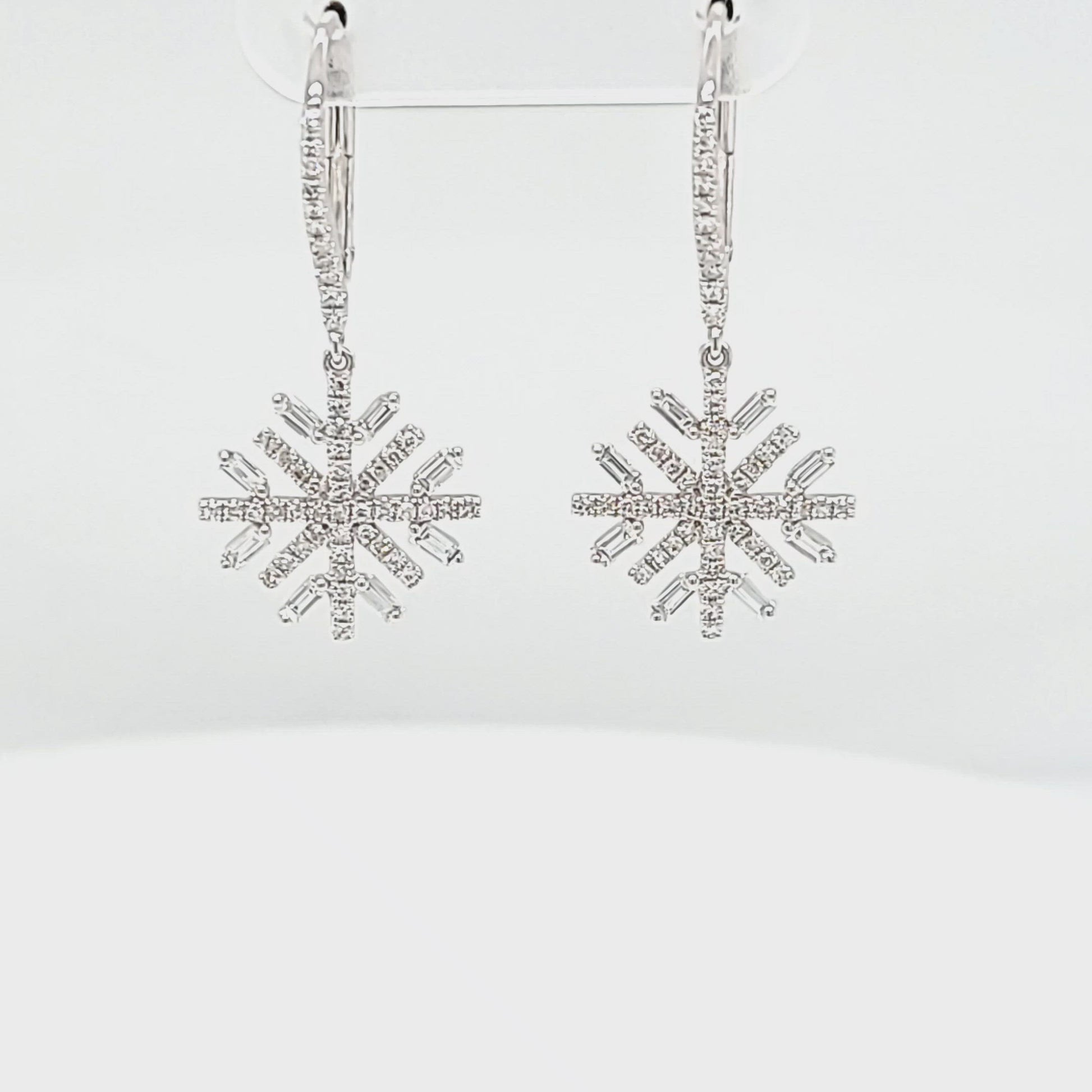 Each earring, exquisitely set in 14K white gold, features an enchanting dance of round and baguette diamonds. The center boasts a dazzling array of demi-pave set round diamonds, while the baguette diamonds gracefully accent the snowflake's branches, capturing the ethereal elegance of winter's unique gem. Adding to their brilliance, cascading round diamonds adorn each earring's front, ensuring every angle catches the light.