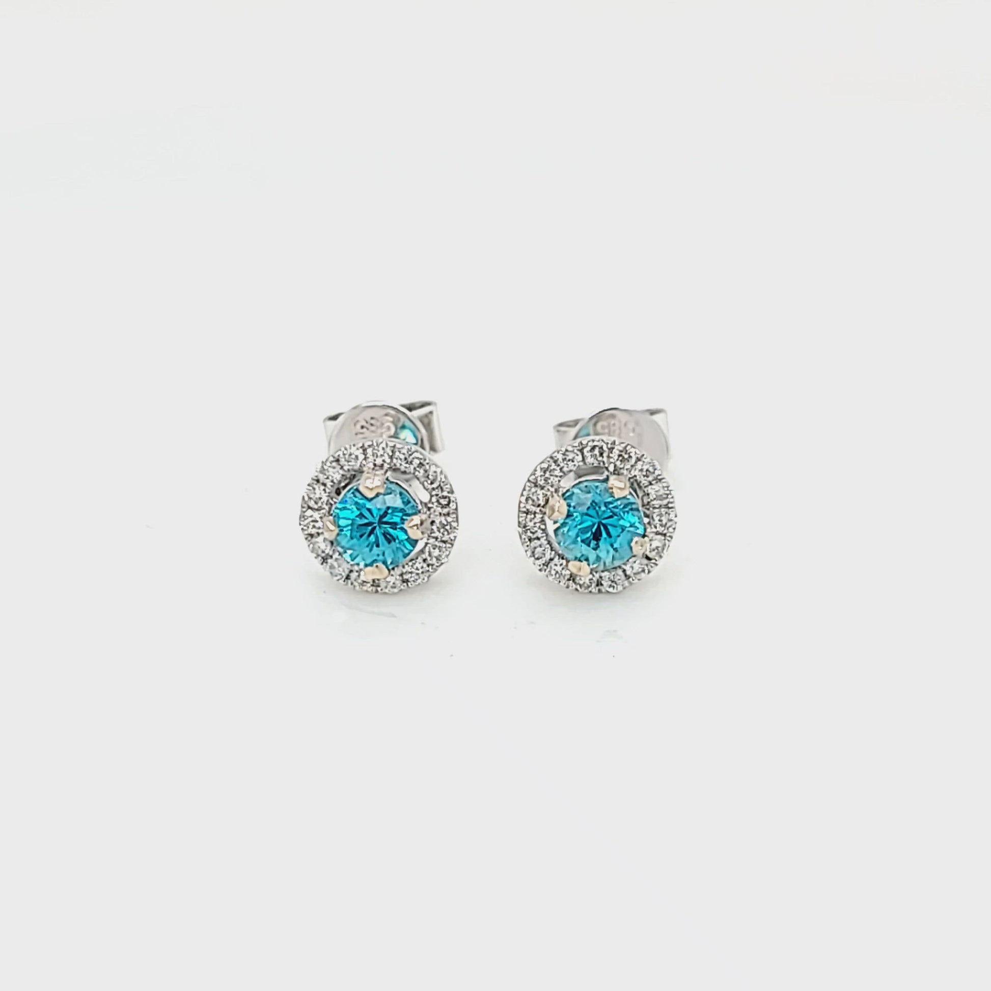 Round Blue Zircon & Diamond Halo Stud Post Earrings