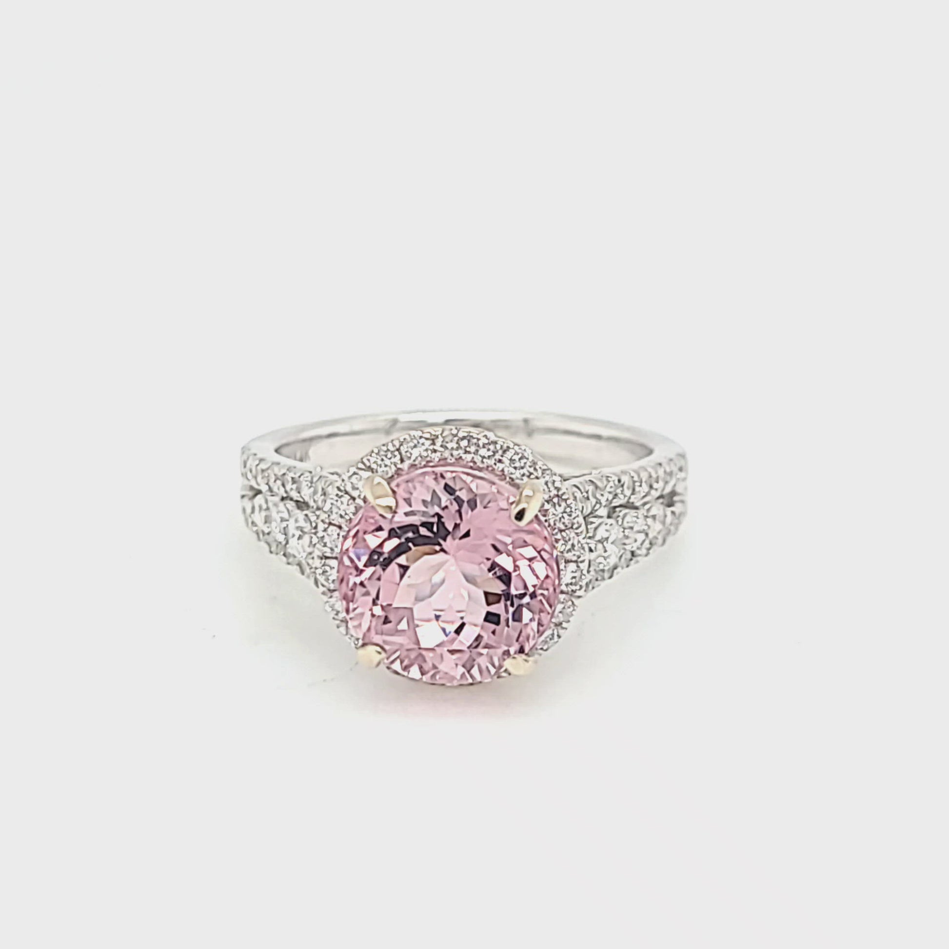 Invite love, elegance, and a touch of modern flair into your life with this alluring morganite and diamond ring. At the heart of this piece is a 9.0mm round fancy cut morganite, gleaming with a soft pink hue that captures the essence of love's tender moments. This gem, known for its associations with compassion and healing, boasts clarity and radiance that's unparalleled.