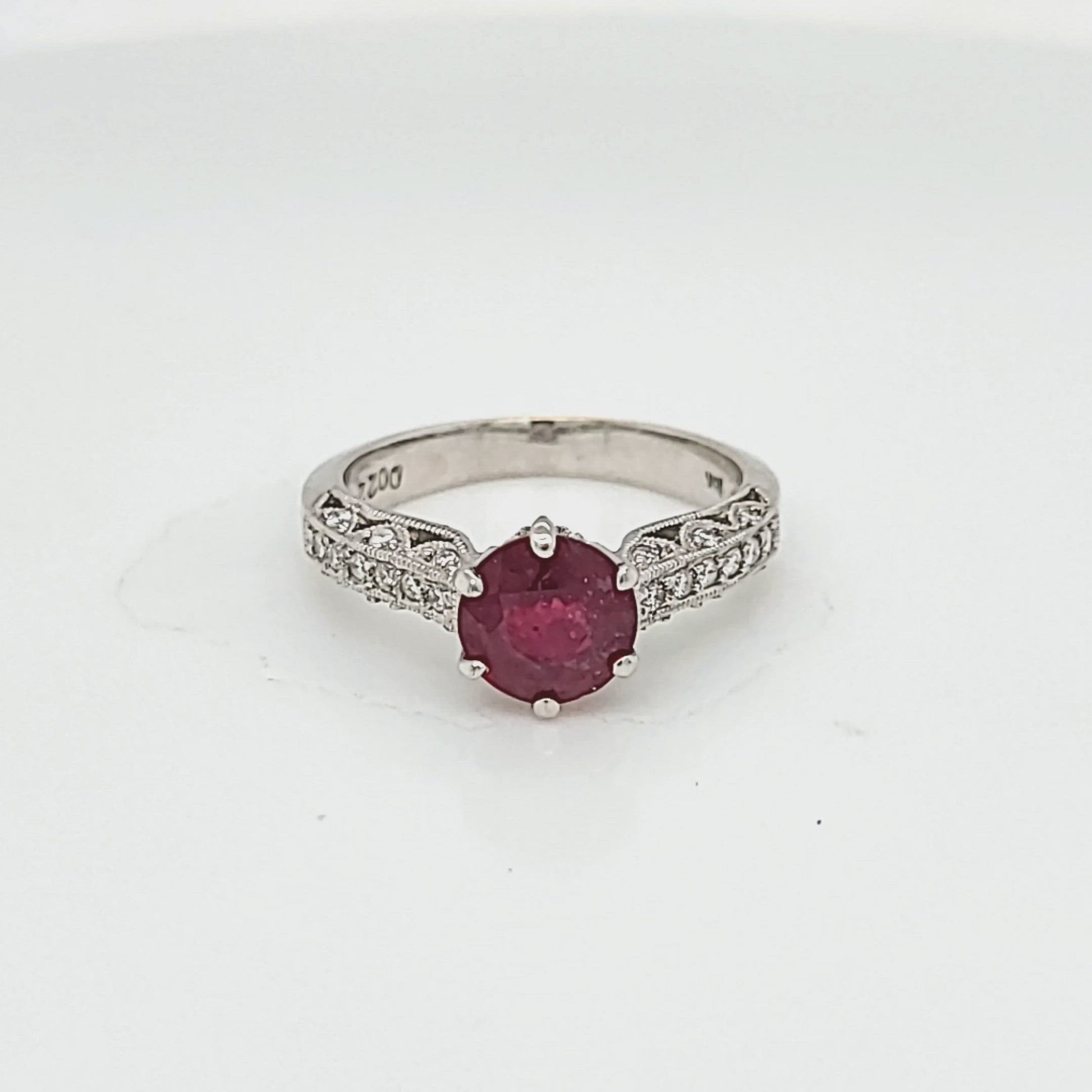 Discover the breathtaking beauty of our Intricate Glass-Filled Ruby and Diamond Ring. This exquisite ring features a 1.69 carat glass-filled ruby, celebrated for its vibrant red hue and captivating allure. The ruby is securely held by bold prongs of 18K white gold, creating a striking centerpiece. Accentuating the ruby are .22 carats of round diamonds, meticulously set along the ring's shoulders, providing an illuminated brilliance on each of the three visible sides.