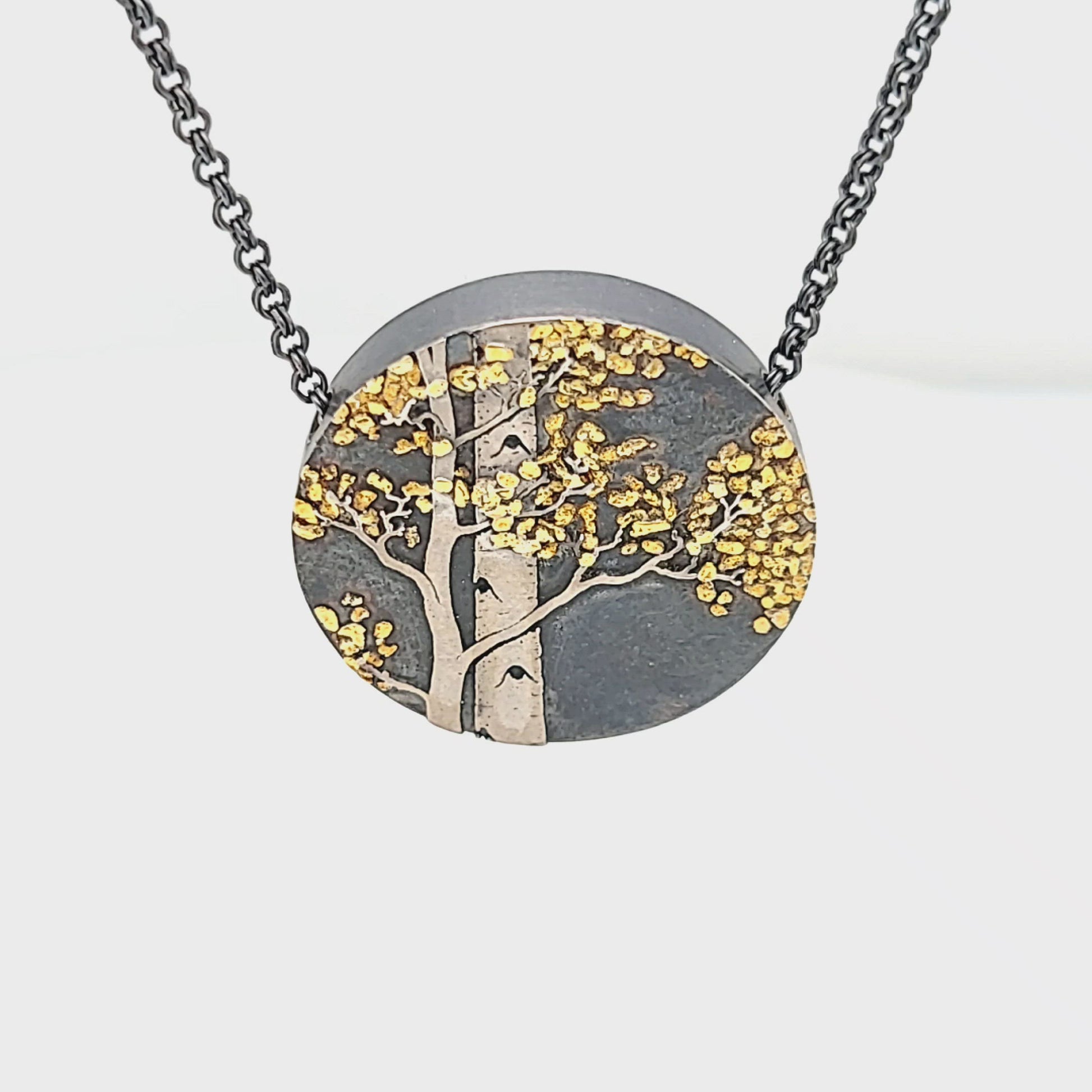 Embrace the serene beauty of nature with our Sterling Silver, 18K Gold, & Nugget Gold Aspen Adorn Pendant. This exquisite circular pendant features intricately detailed aspen branches crafted from sterling silver with black antiquing, creating a striking contrast against the natural gold nugget leaves. The blend of cool, antiqued sterling silver and the warm, rich tones of 18K gold and gold nugget leaves results in a captivating and elegant design.