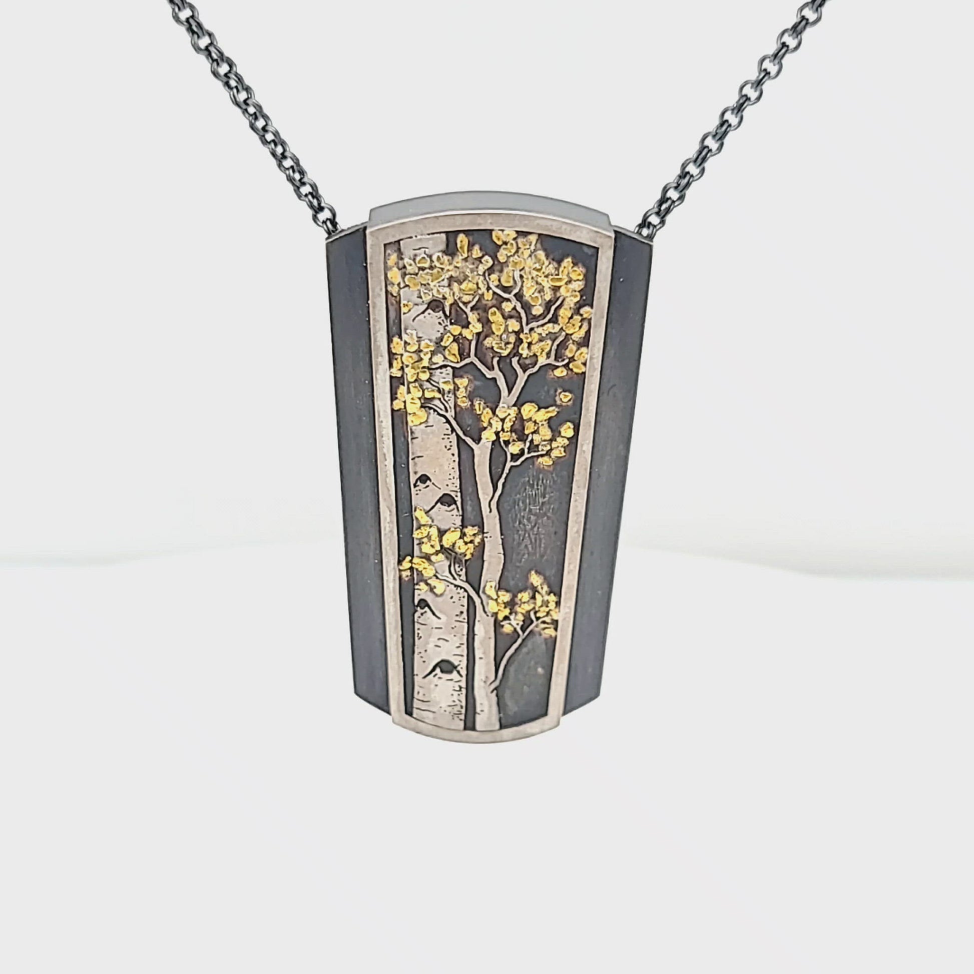 The contrast between the cool sterling silver and the warm, rich tones of 18K gold and gold nugget leaves creates a captivating and elegant design. The Aspen Duet Pendant is a perfect representation of the tranquil beauty of an aspen grove, making it a timeless addition to your jewelry collection.
