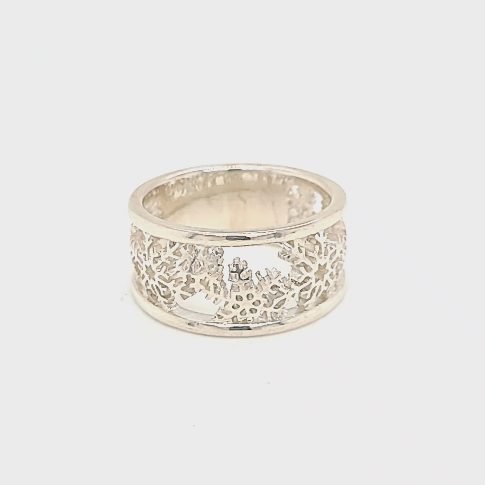Step into a poetic embrace of winter with our Sterling Silver Snowflake Cutout Band. This delicate creation is a celebration of nature's most transient beauty – the snowflake, immortalized forever in sterling silver.