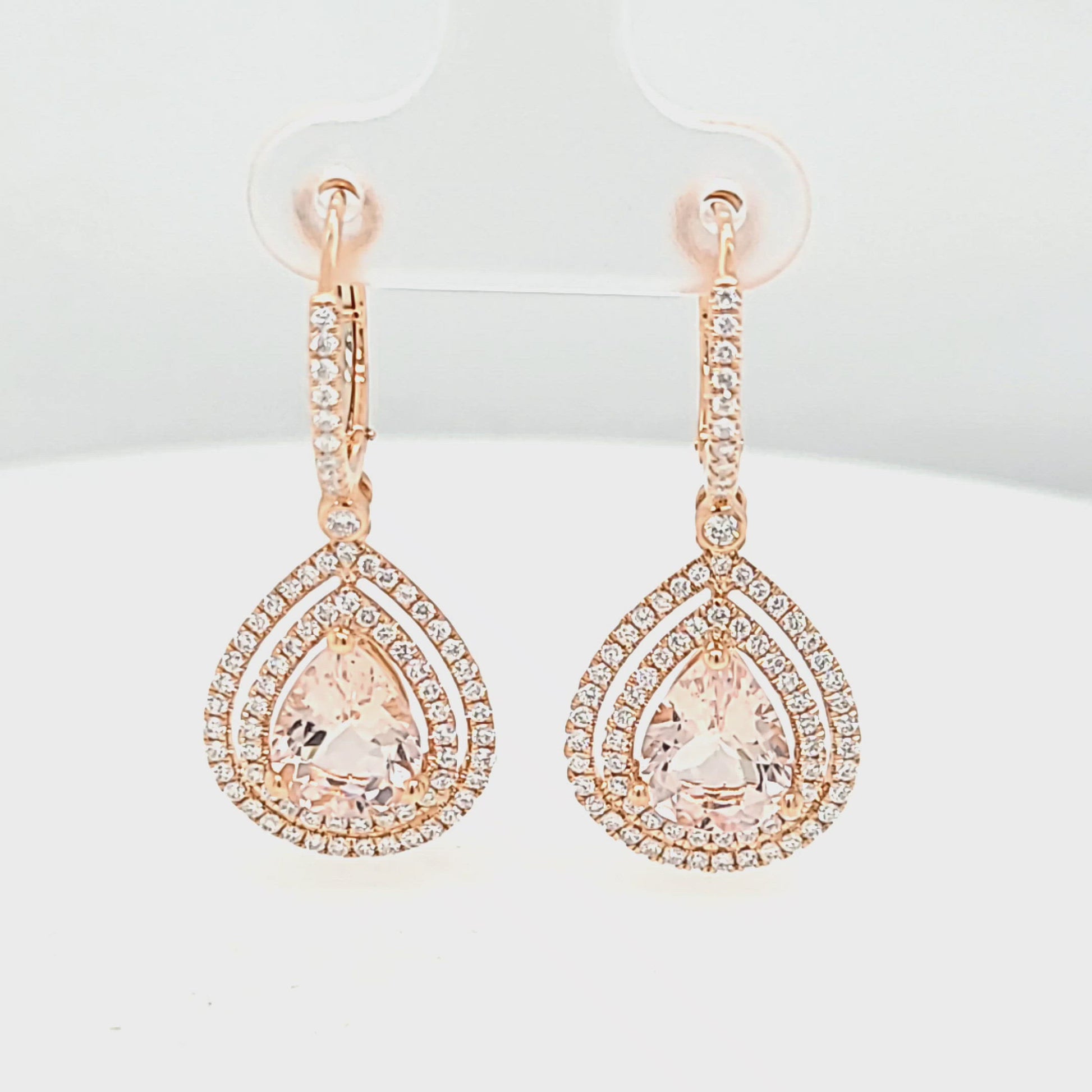 Tear Drop Pink Morganite and Double Diamond Halo Drop Earrings