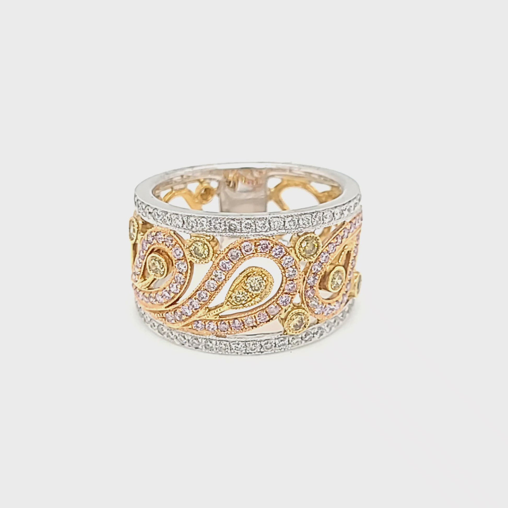 Discover the epitome of sophistication and grace with the Tri-Colored Gold & Diamond Filigree Band, a jewel in the crown of Park City Jewelers' exquisite collection. This ring is a perfect harmony of colors and sparkle, expertly crafted in 18K yellow, white, and rose gold. It features a stunning .32ctw of colorless diamonds elegantly set along the front and back, creating a radiant frame that captures the essence of classic beauty. The heart of the ring is adorned with a delicate pink diamond filigree on 14K rose gold, imbued with a .34ctw of pink diamonds, offering a soft, romantic glow. Complementing this are the .18ctw yellow diamond accents, intricately set within the filigree design, adding a touch of warmth and intrigue.