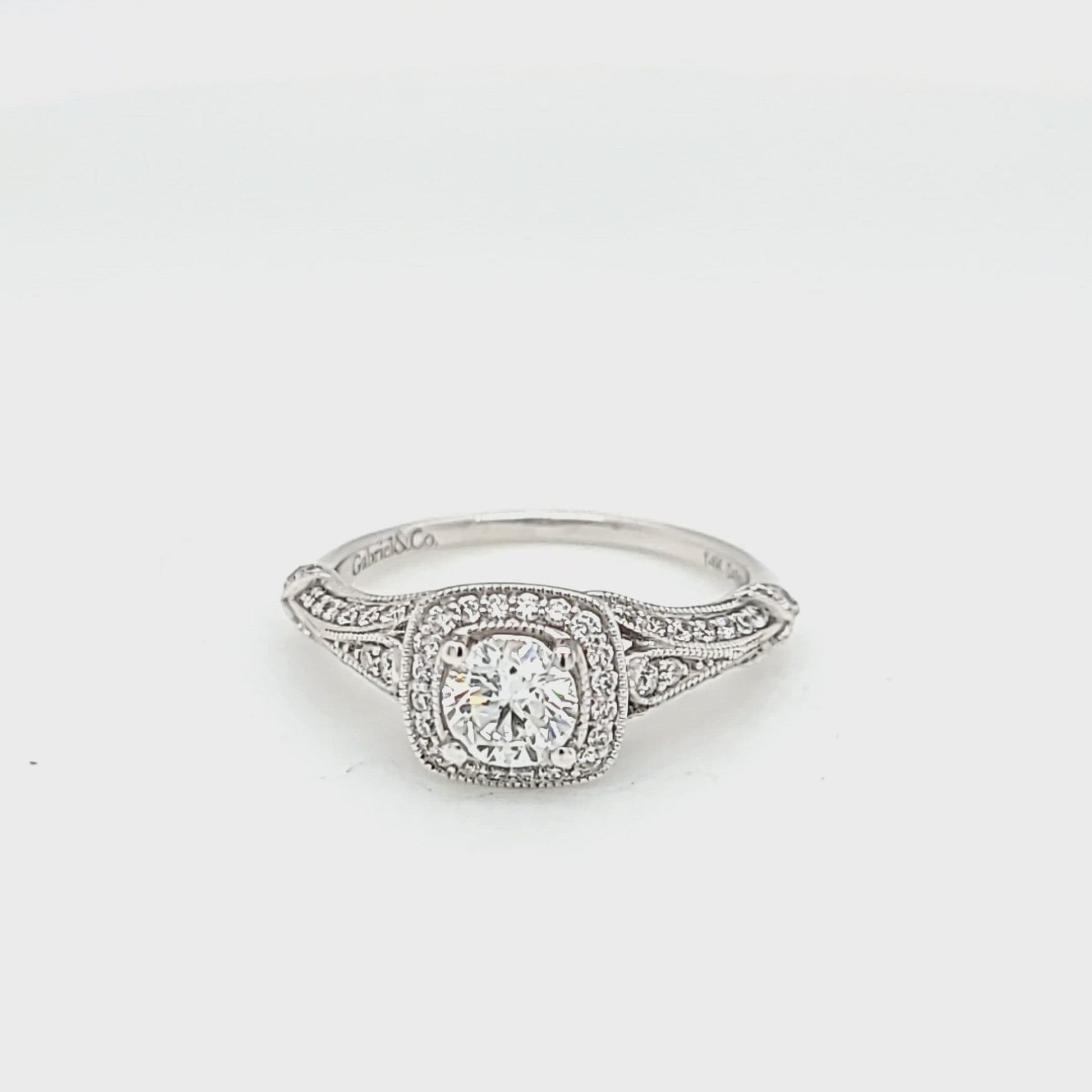 Shimmering at the center of this vintage-inspired design is a .85 carat round diamond with a G/H color grading with an SI2 clarity. An angled halo of demi-pave set diamonds surrounds the center diamonds with an illuminating brilliance. The shoulders of the ring are enhanced with the shimmering brilliance of demi-pave set round diamonds. Milgrain edging completes the vintage-inspired elegance of this incredibly beautiful and captivating design. Capture her heart and everlasting love with this unique engagement ring.