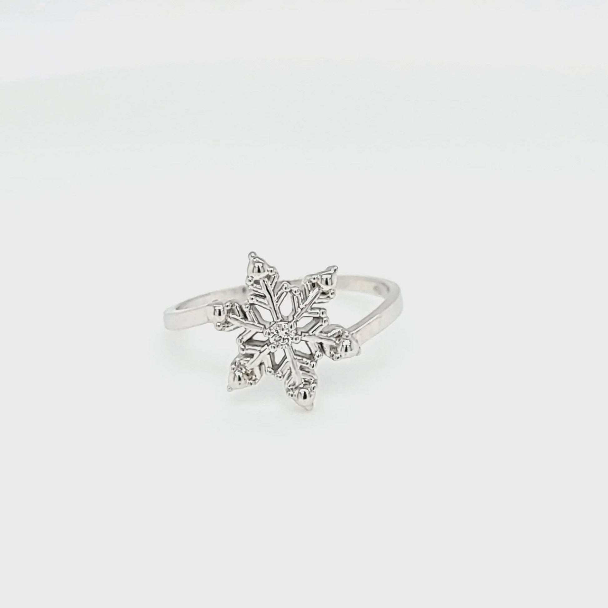 Handcrafted with precision and passion, the centerpiece snowflake is set with a radiant .03 carat diamond. It gleams with a luminosity that mirrors the soft glow of a winter moon, casting reflections that dance with every movement of your hand. The bypass shank design weaves seamlessly around the finger, adding an elegant flair that's both contemporary and timeless.