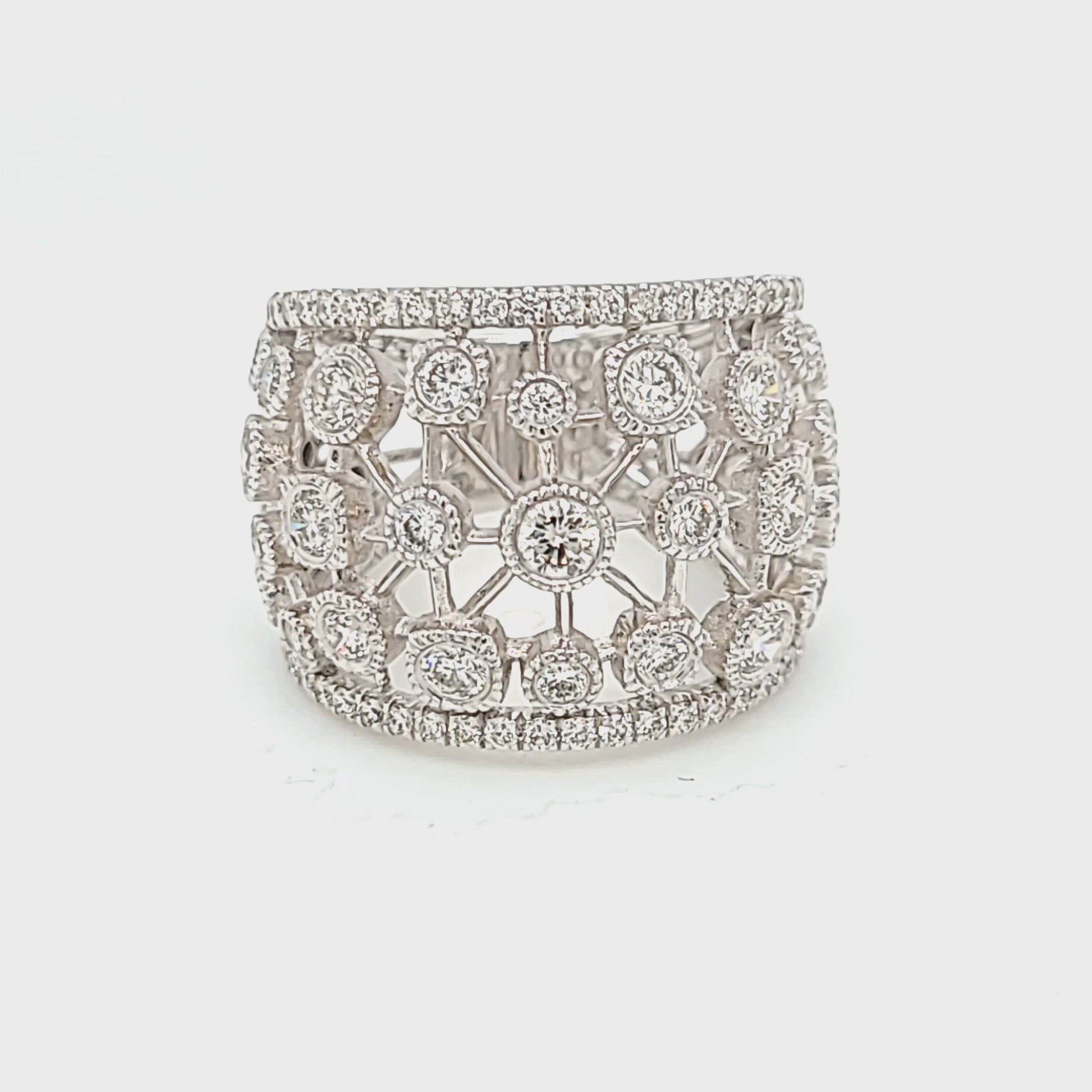 A Tapestry of Diamonds and Detail In this exquisite ring, the varied sizes of the bezel-set diamonds create a playful yet elegant visual effect, reminiscent of vintage jewelry. The milgrain detailing around each diamond adds texture and depth, showcasing Park City Jewelers' attention to detail and mastery of jewelry design. The demi-pave set diamonds on the band's edges provide a sparkling frame, enhancing the central design's beauty. This ring is not just a piece of jewelry; it's a work of art that reflects a blend of traditional elegance and contemporary style.