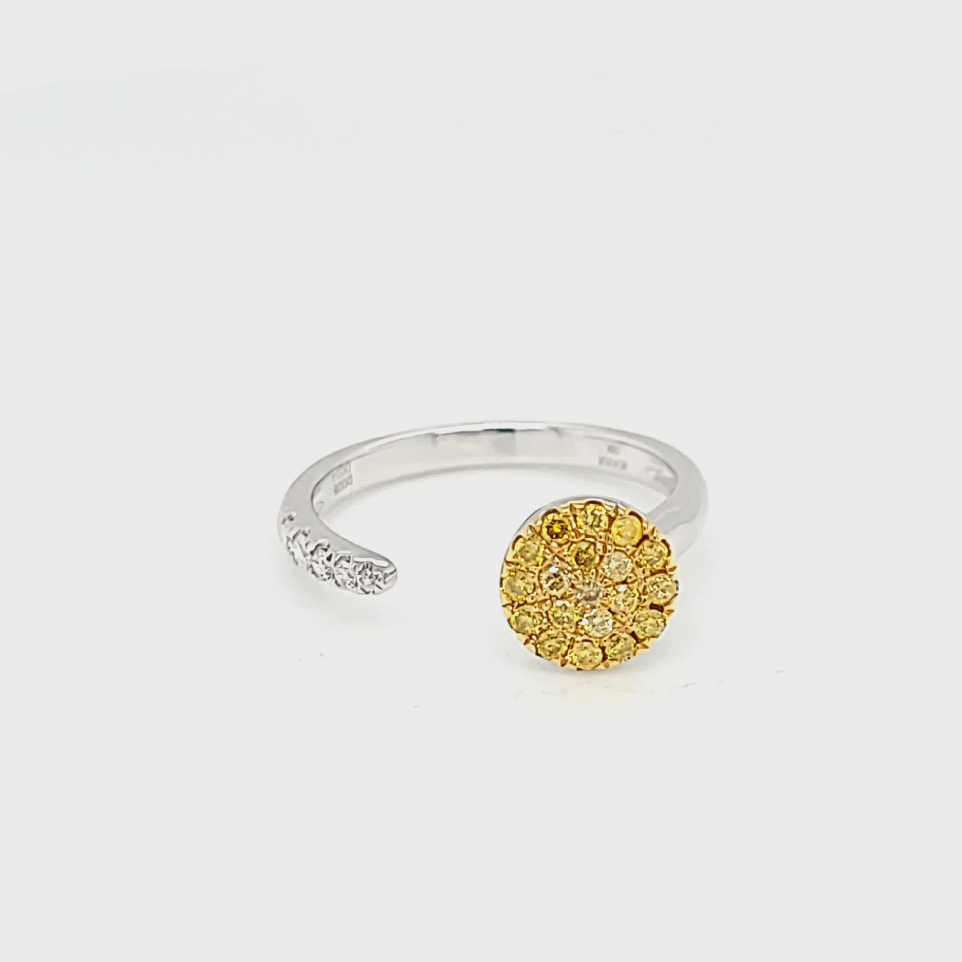 Discover the striking elegance of the Yellow Diamond Cluster and Diamond Open Center Ring, a masterpiece crafted in the exquisite union of 18K white and yellow gold. This ring showcases a unique open center design, epitomizing modern sophistication and luxury. On one side, a vibrant cluster of .24ctw yellow diamonds dazzles, offering a warm, sunlit radiance. Mirroring this brilliance, the other side features a sleek line of .08ctw colorless diamonds, set in 18K white gold, providing a striking contrast and a balance of cool elegance.