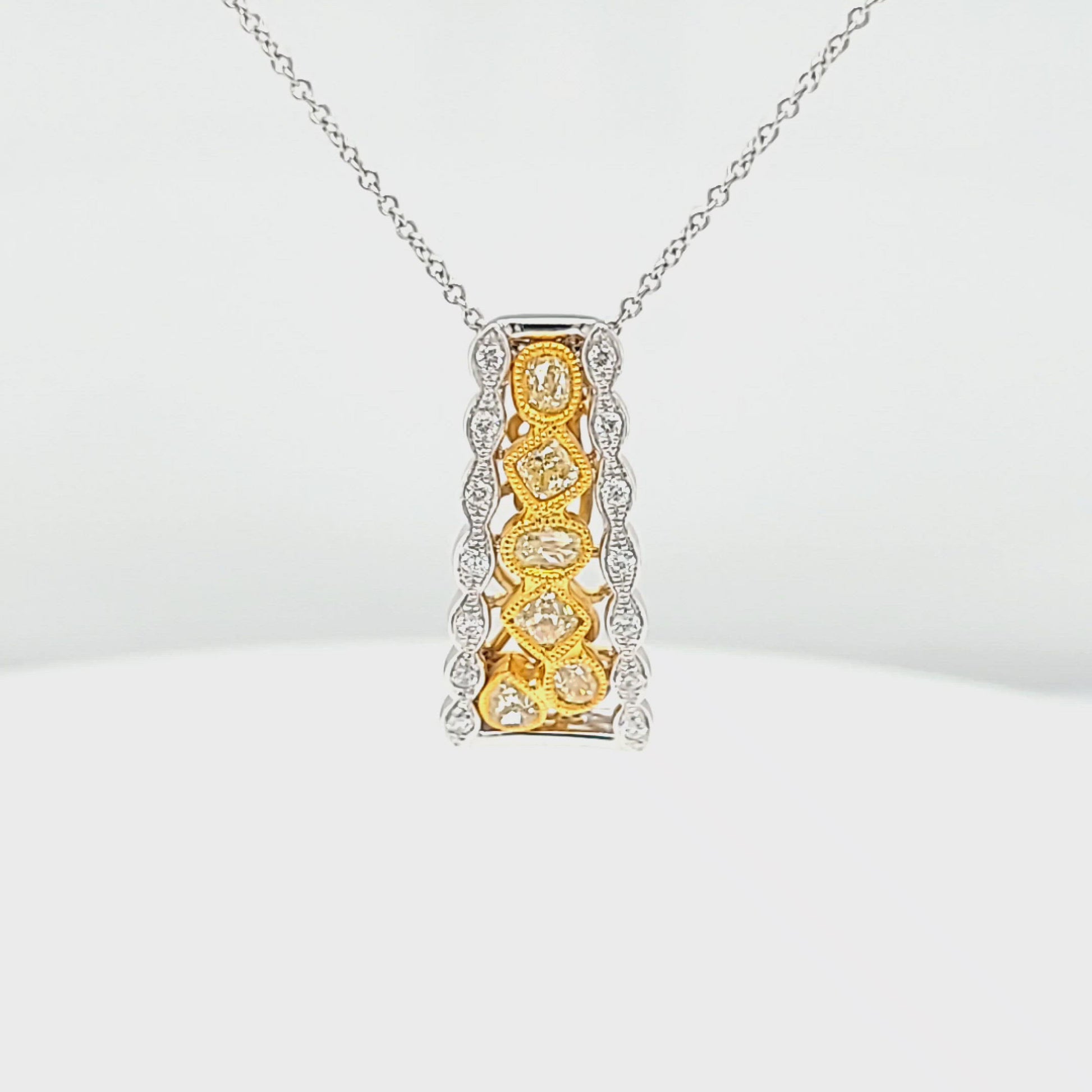 A Harmony of Colors and Craftsmanship This pendant showcases Park City Jewelers' expertise in creating pieces that blend colors and textures seamlessly. The yellow diamonds in the center offer a rich, sunlit hue, while the white diamonds provide a classic, timeless sparkle. The milgrain detailing on both the white and yellow gold settings adds a touch of vintage charm, making this piece not just a pendant but a work of art.